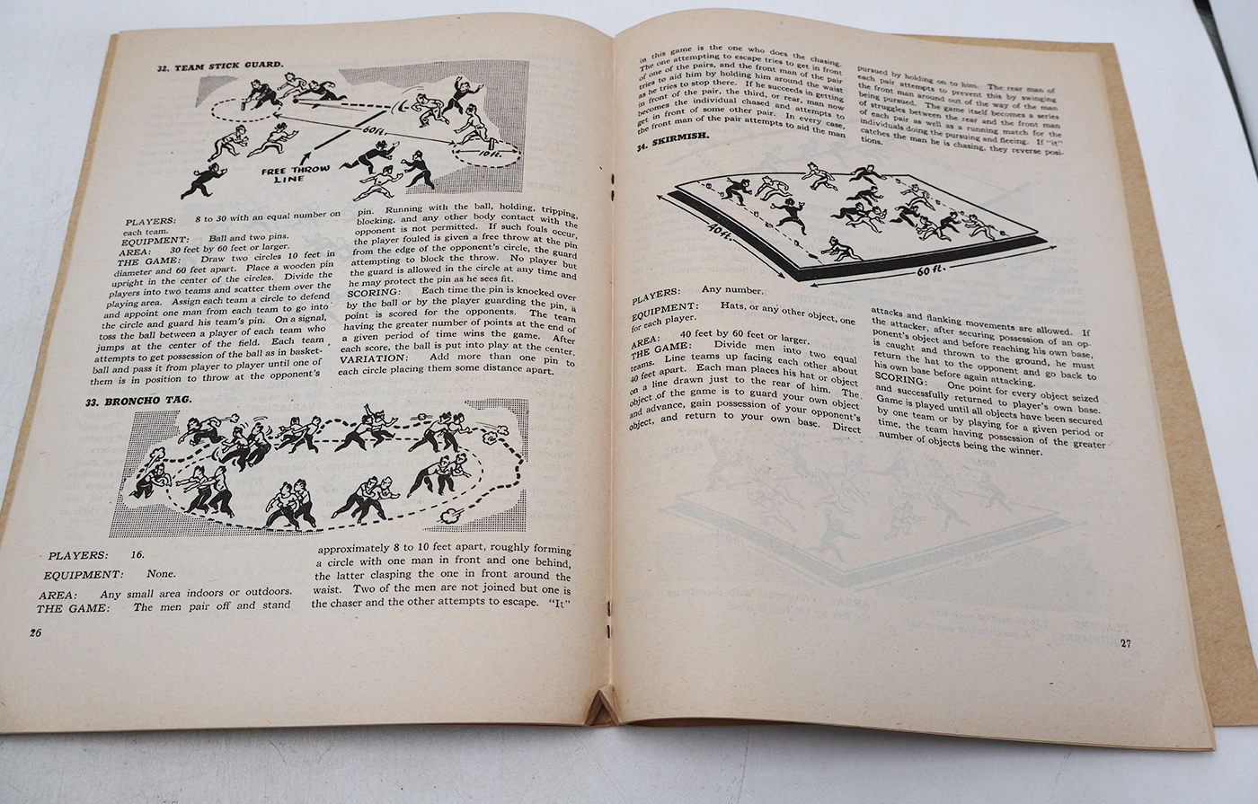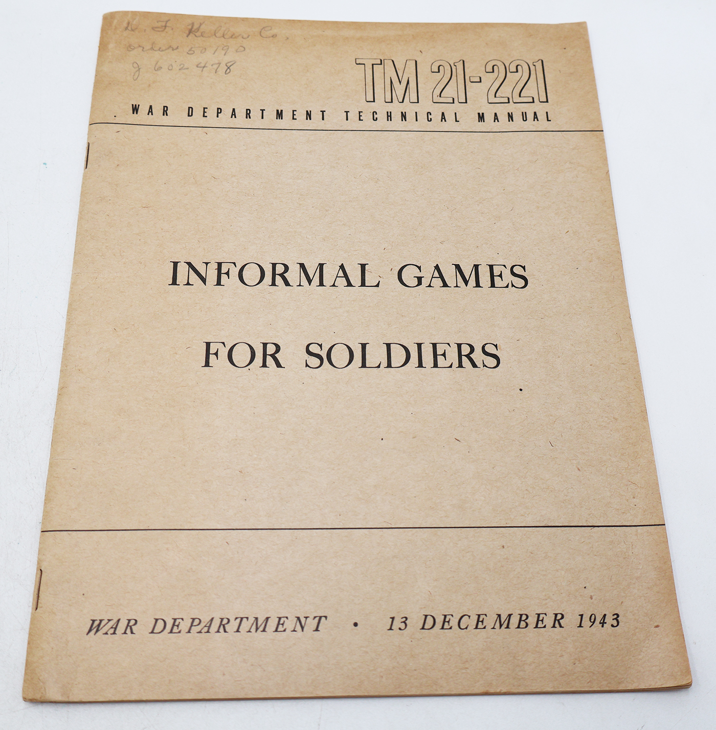 WWII US War Department Manual Handbook on Informal Games For Soldiers. Softbound. Dated 1943. Marked TM 21-221. 56 pages. Lots of great illustrations and photos. Wear to the cover, but pages and binding are strong. No torn or missing pages.