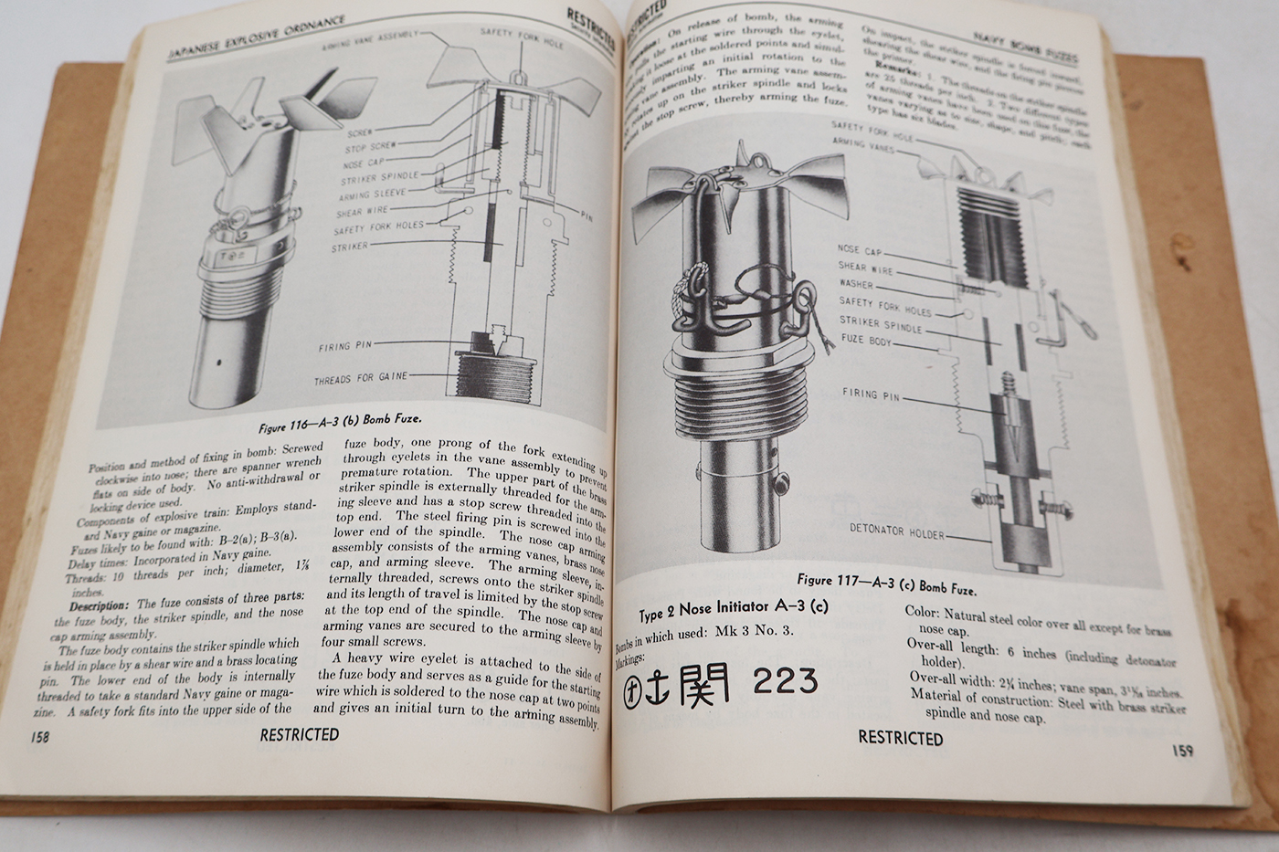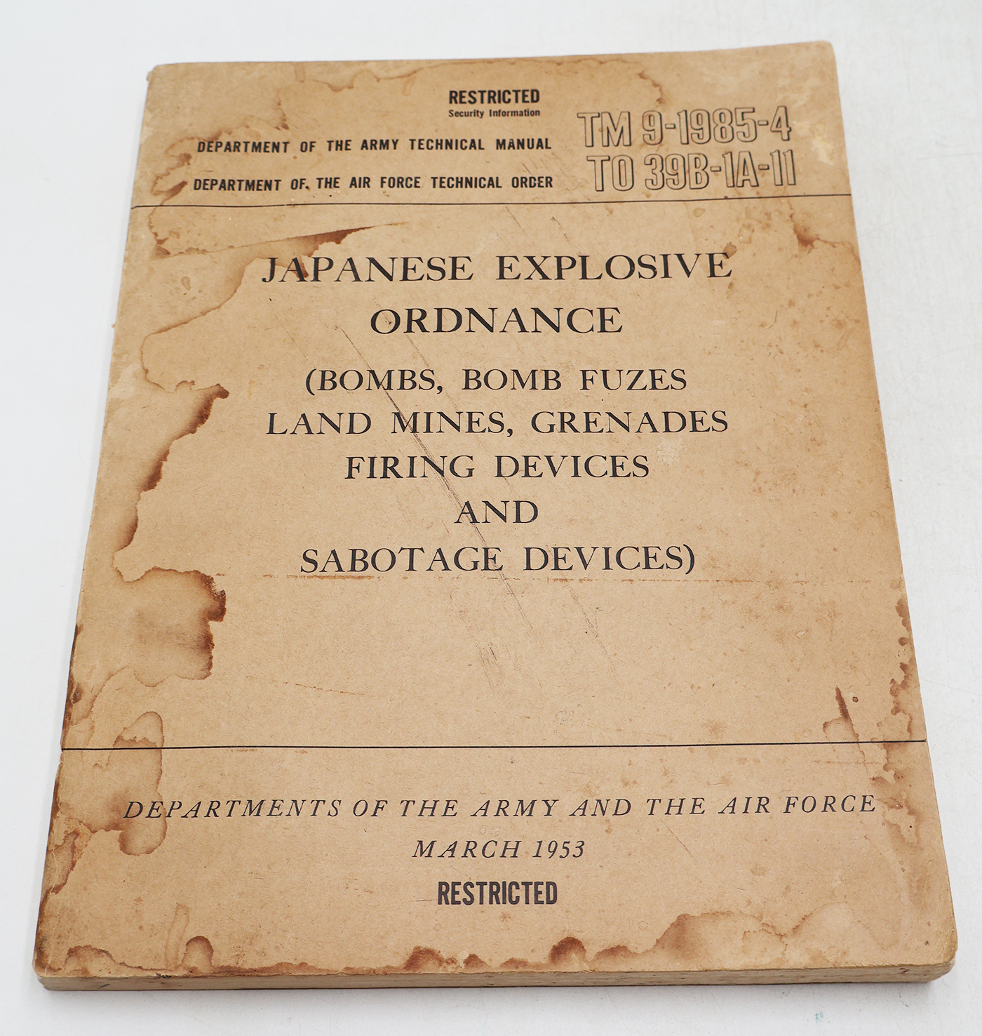 Post WWII US War Department Manual Handbook On Japanese Explosive Ordnance. Softbound. Dated 1953. Marked TM 9-1985-4. 263 pages. Lots of great illustrations and photos. Cover is worn from age, but pages and binding are in good condition. No torn or missing pages.