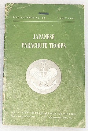 WWII Japanese Parachute Troops War Department Manual. Softbound. 61 pages. Dated 1 July 1945. Titled SPECIAL SERIES NO 32 1 JULY 1945 JAPANESE PARACHUTE TROOPS MILITARY INTELLIGENCE DIVISION WAR DEPARTMENT WASHINGTON, D.C.. Some good black and white images of the paras and their weapons. Someone scratched out something with ink pen on cover and first page. These are printed on very poor paper and the front and back cover are present but are loose and no longer connected. No matter what this is a tough manual to find.