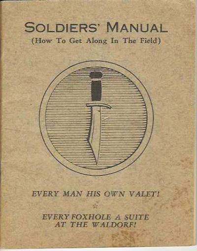 WWII Kiska Task Force Soldier's Manual ( How To Get Along In The Field Manual). Small size. Cardboard stock cover. Has a great likeness of the KTF patch on The cover. 50 pages. Mostly text but the back half has lots of illustrations. Named inside to an SSGT in Company H 17th Infantry. Shows very minor storage wear.