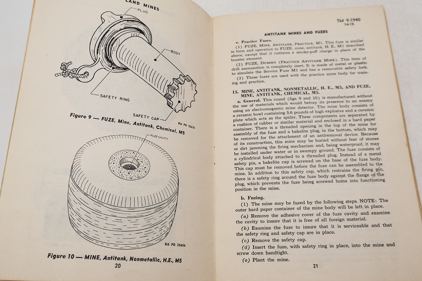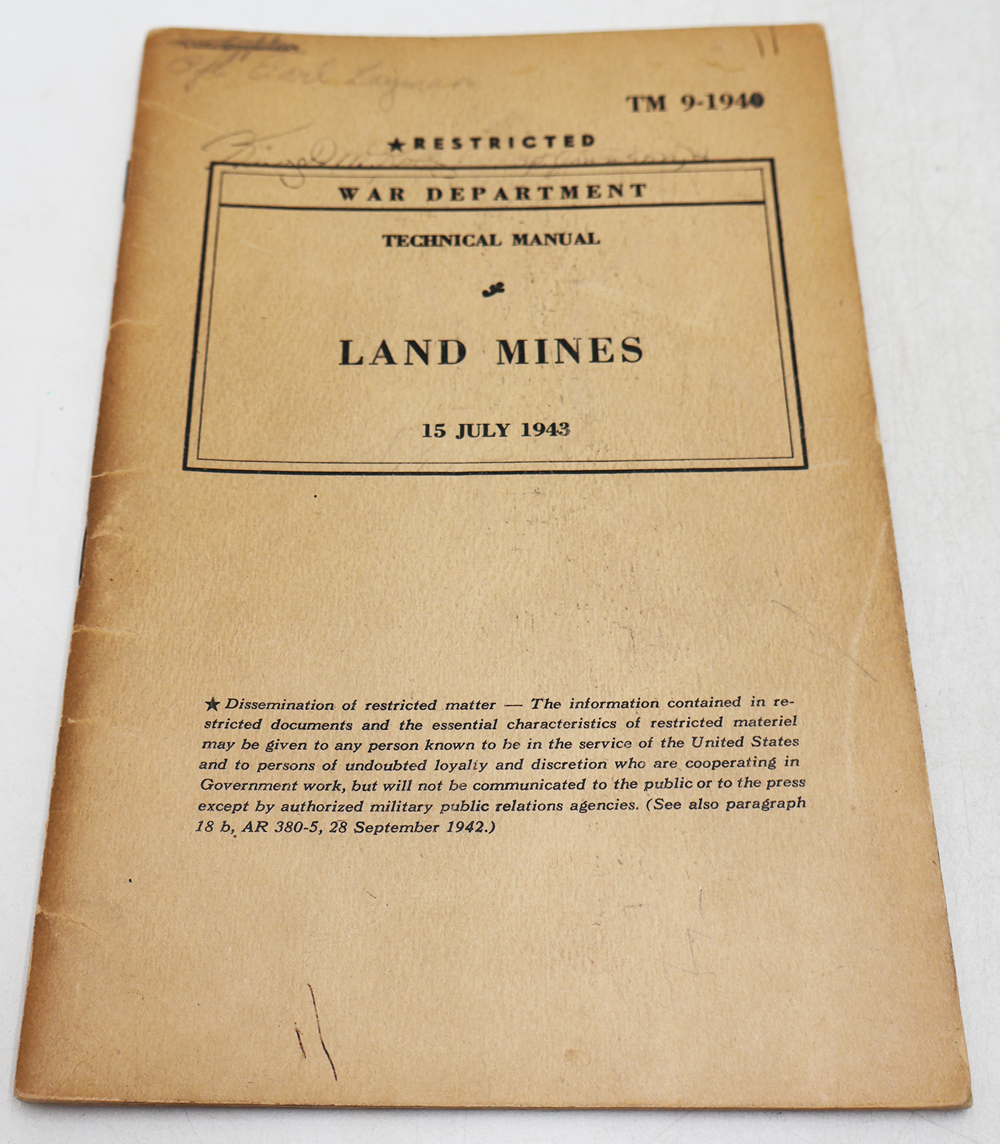 WWII US War Department Manual Handbook On Land Mines. Softbound. Dated 1942. Marked TM 9-1940. 51 pages. Lots of great illustrations and photos. Minor wear from age. No torn or missing pages.