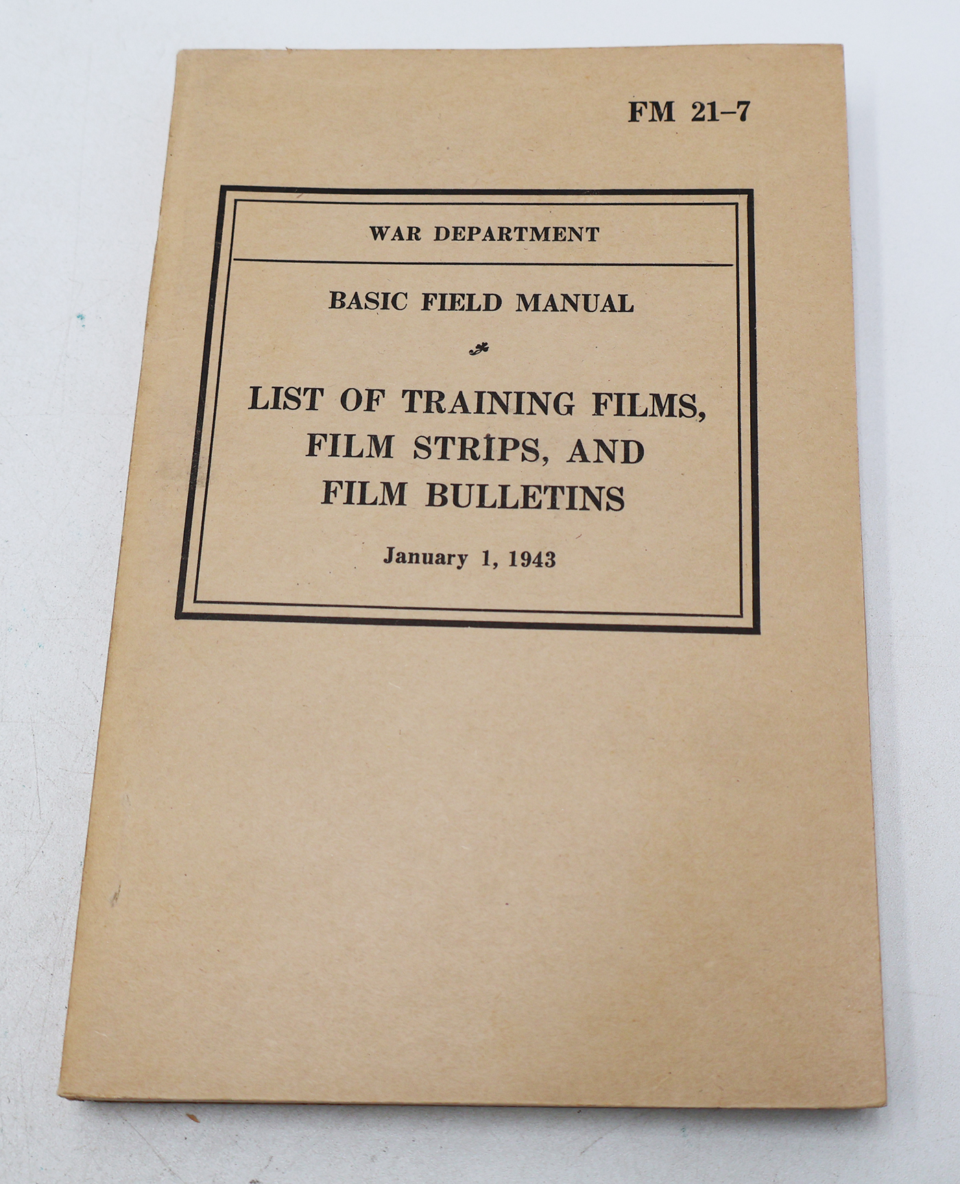 WWII US War Department Manual Handbook On the List of Training Films. Softbound. Dated 1943. Marked FM 21-7. 280 pages. Minor wear to the cover, but pages and binding are strong. No torn or missing pages.