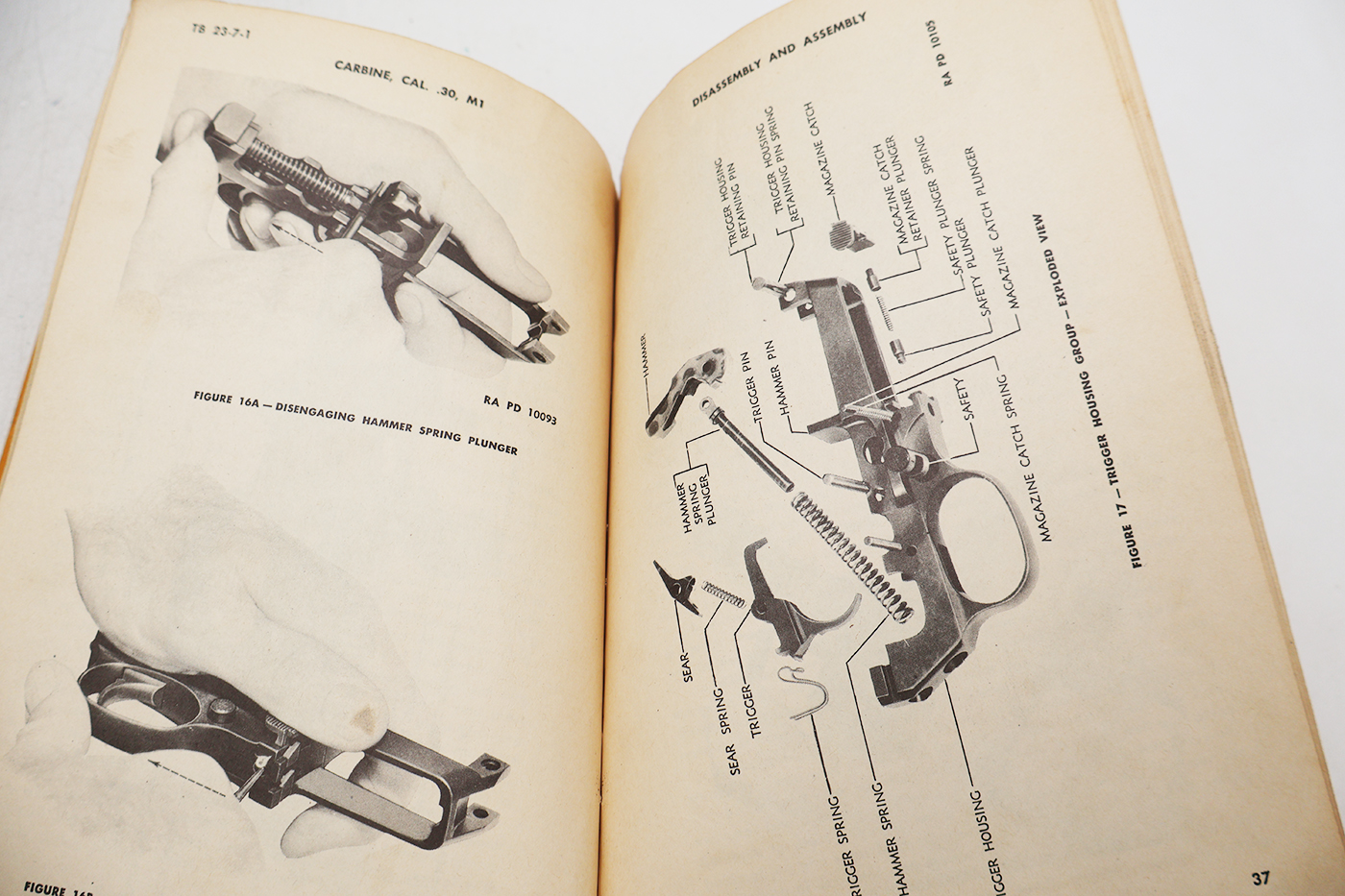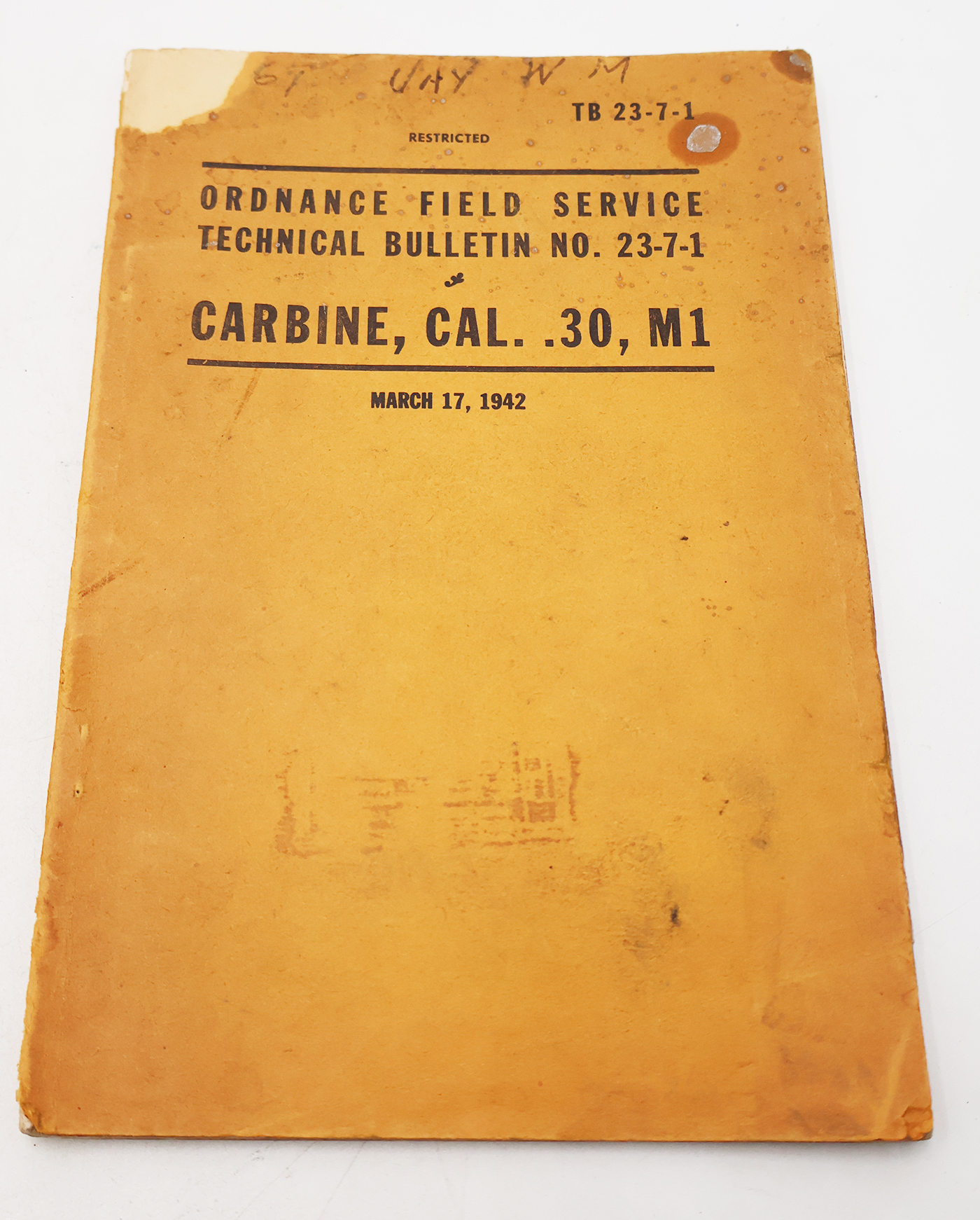 WWII US War Department Manual Handbook On M1 Carbine, cal. .30. Softbound. Dated 1942. Marked TB 23-7-1. 67 pages. Lots of great illustrations and photos. Wear to the cover, but pages and binding are strong. No torn or missing pages.