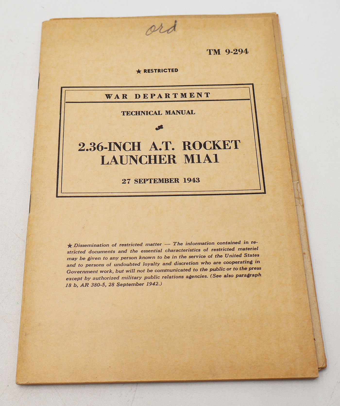 WWII US War Department Manual Handbook On the M1A1 Bazooka with M9 Addendum. Softbound. Dated 1943. Marked TM 9-294. 81 pages. Lots of great illustrations and photos. Wear to the cover, but pages and binding are strong. No torn or missing pages.