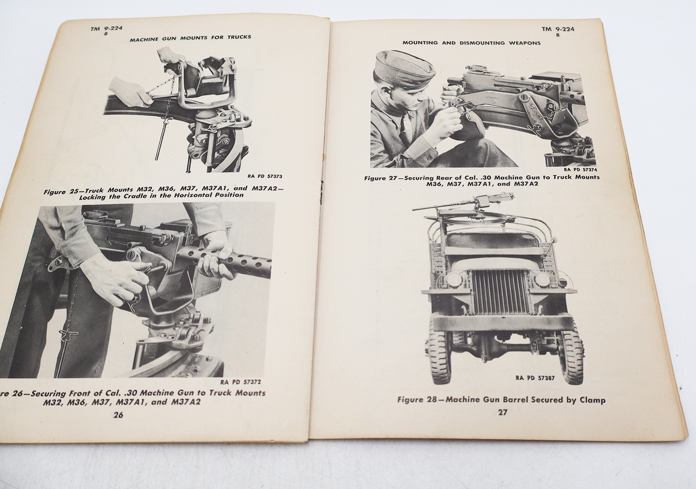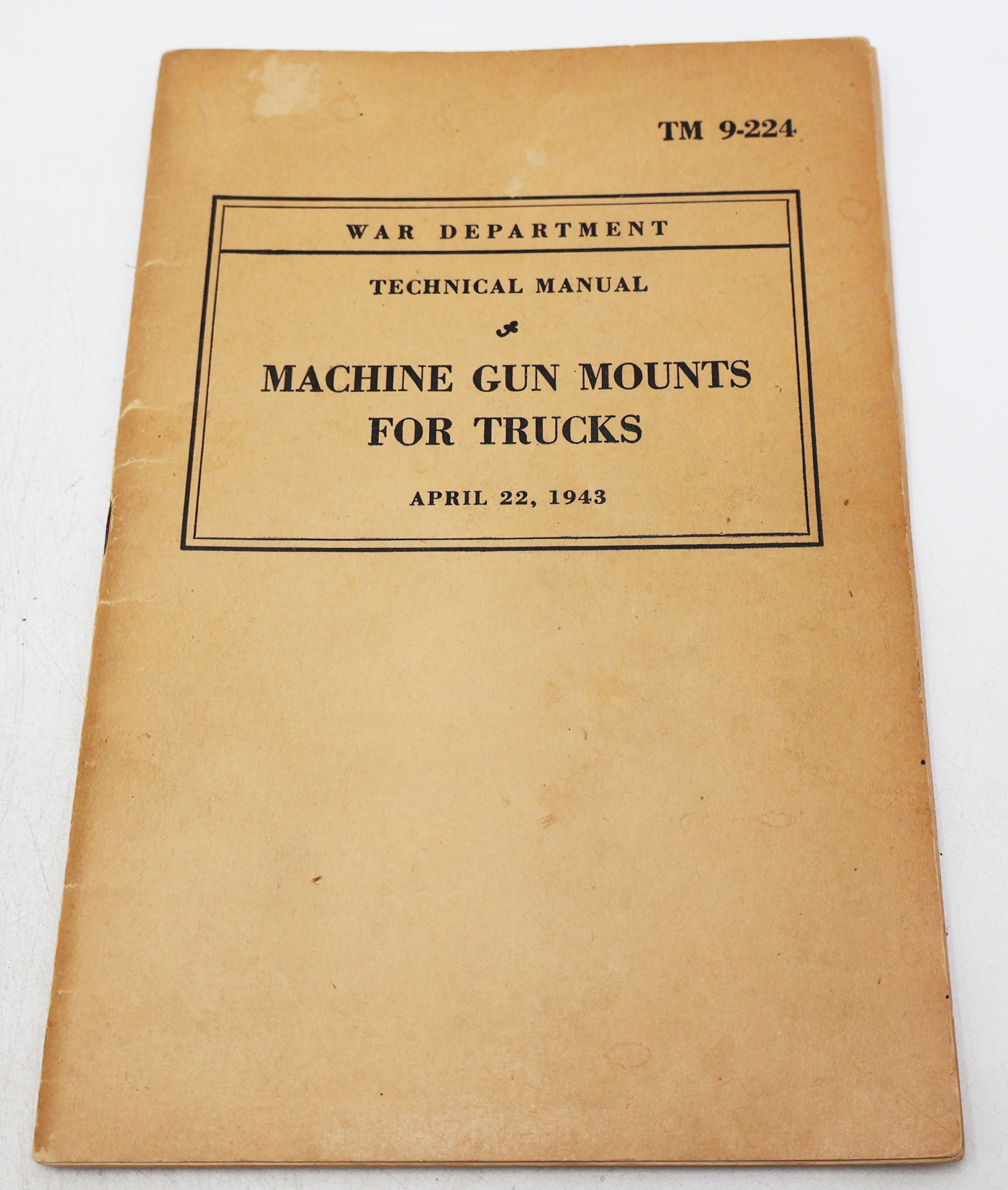 WWII US War Department Manual Handbook On Machine Gun Mounts for Trucks. Softbound. Dated 1943. Marked TM 9-224. 48 pages. Lots of great illustrations and photos. Wear to the cover, but pages and binding are strong. No torn or missing pages.