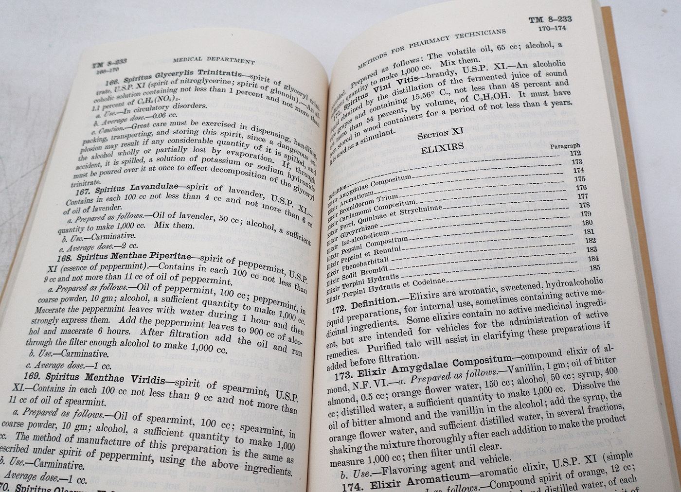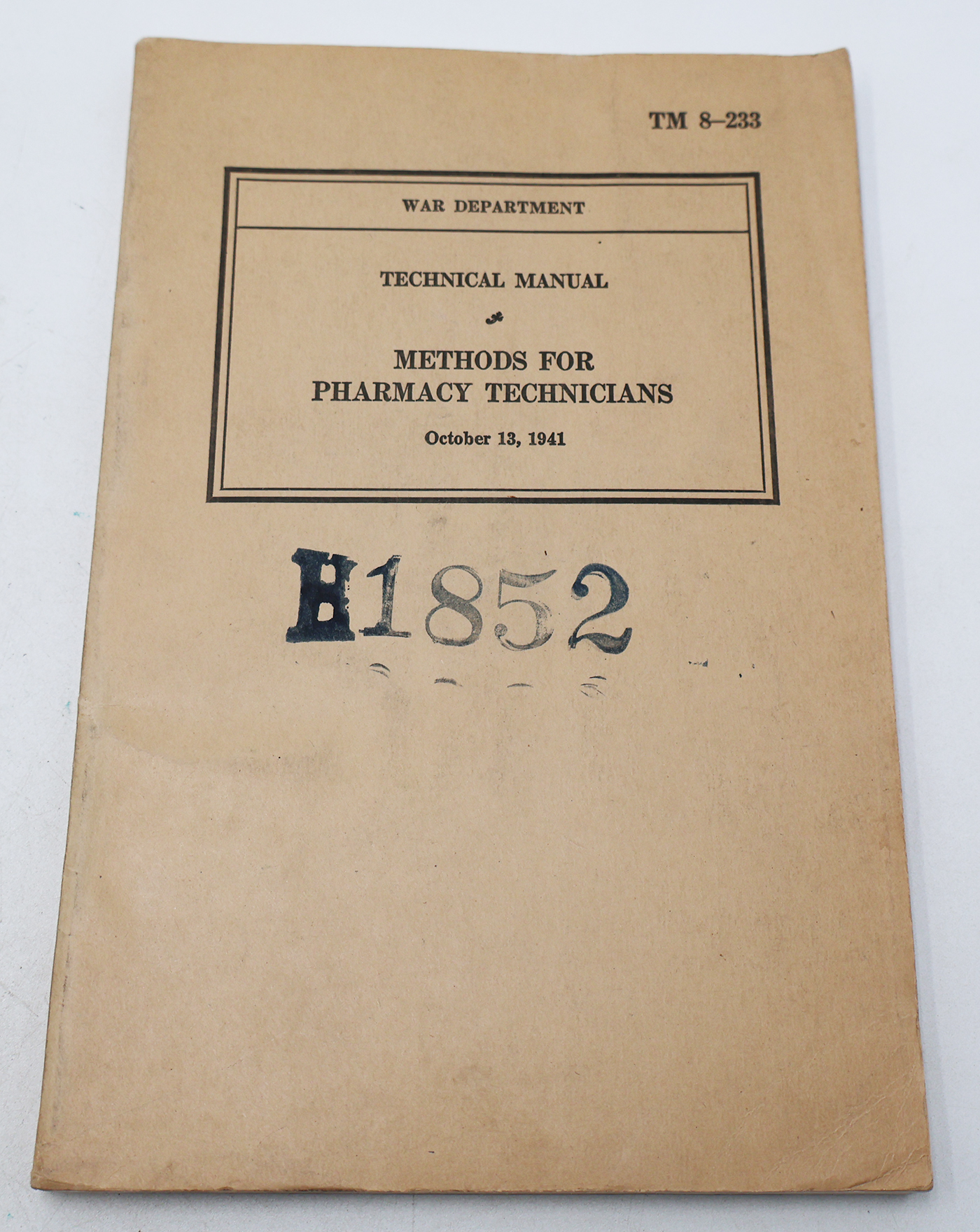WWII US War Department Manual Handbook on Methods for Pharmacy Technicians. Softbound. Dated 1941. Marked TM 8-233. 202 pages. Wear to the cover, but pages and binding are strong. No torn or missing pages.