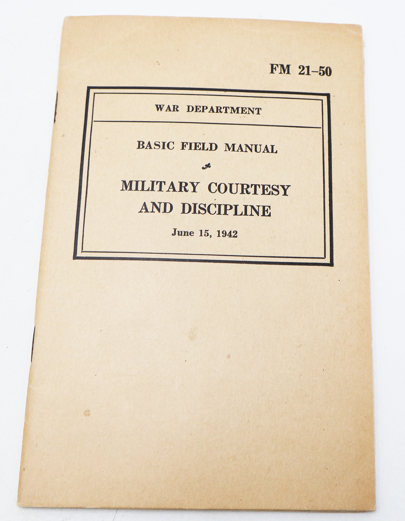 WWII US War Department Manual Handbook on Military Courtesy and Discipline. Softbound. Dated 1942. Marked FM 21-50. 44 pages. Lots of great illustrations and photos. Wear to the cover, but pages and binding are strong. No torn or missing pages.