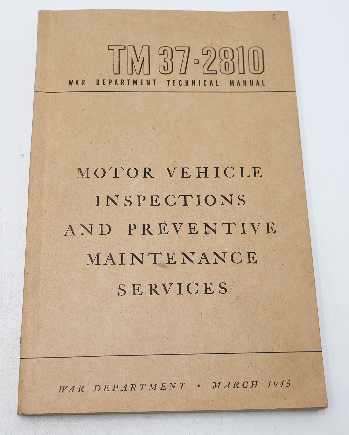 WWII US War Department Manual Handbook on Motor Vehicle Inspections And Preventive Maintenance Services. Softbound. Dated 1945. Marked TM 37-2810. 252 pages. Wear to the cover, but pages and binding are strong. No torn or missing pages.