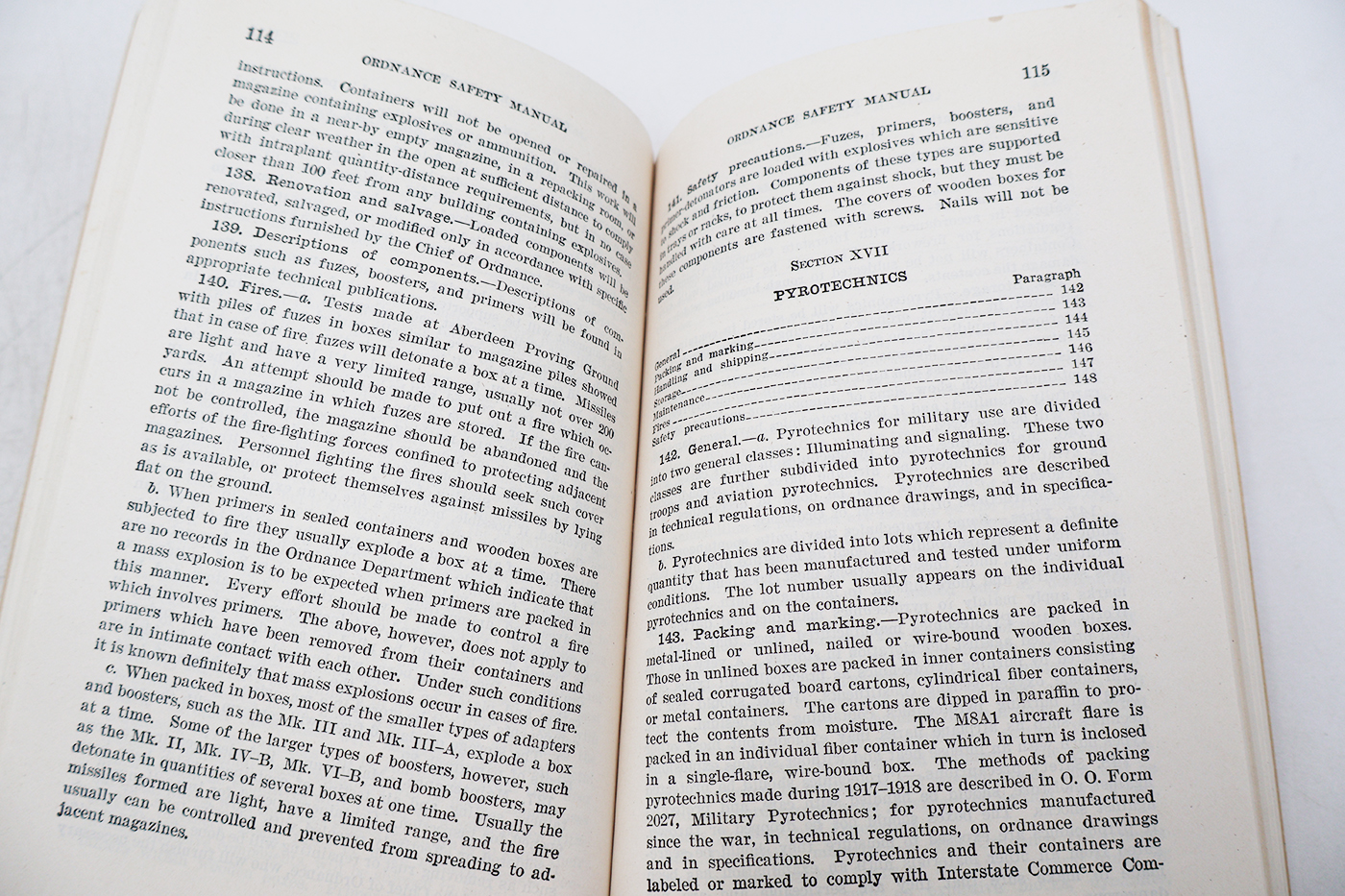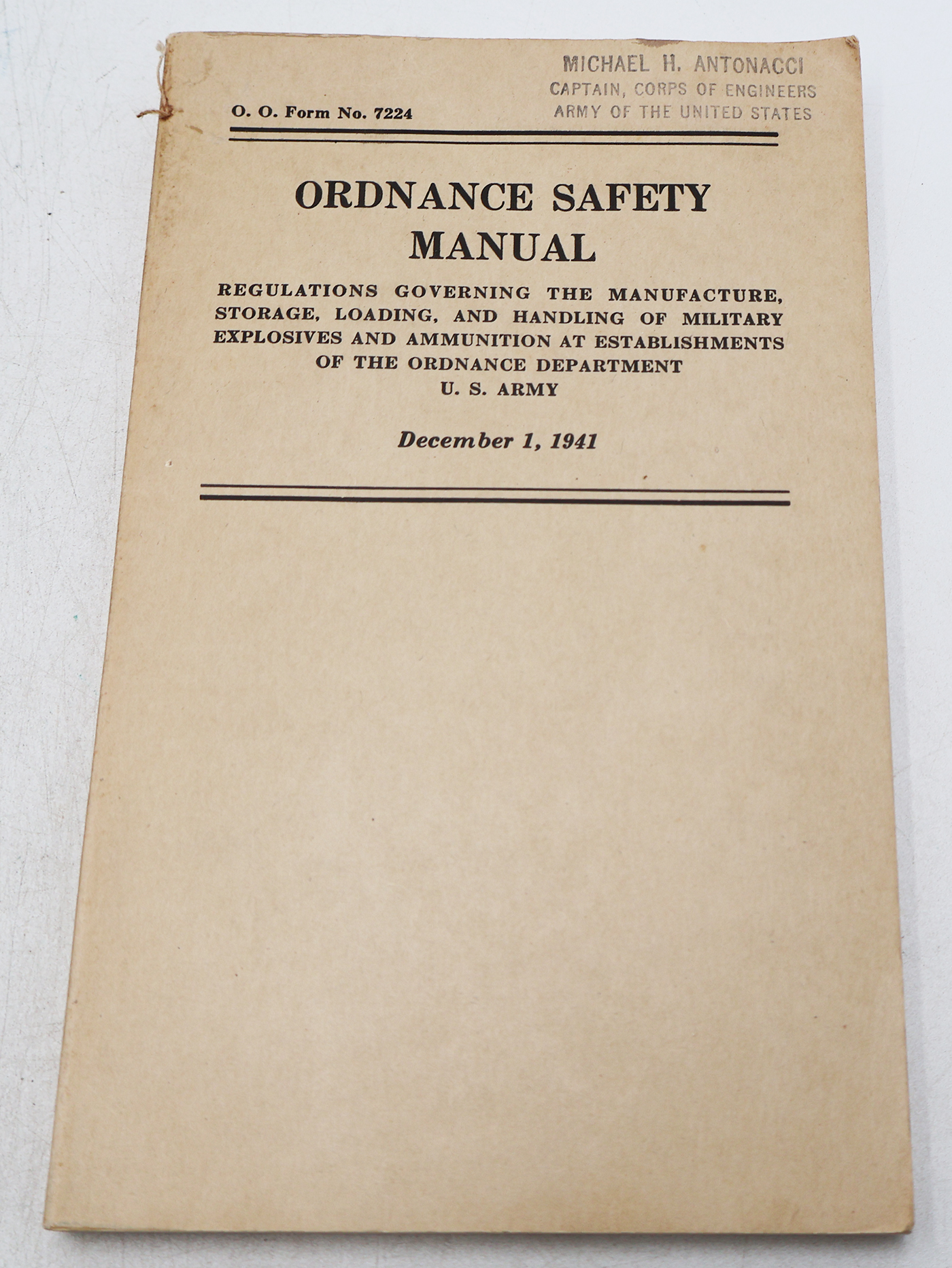 WWII US War Department Ordnance Safety Manual. Softbound. Dated 1941. 221 pages. Minor wear to the cover, but pages and binding are strong. No torn or missing pages.