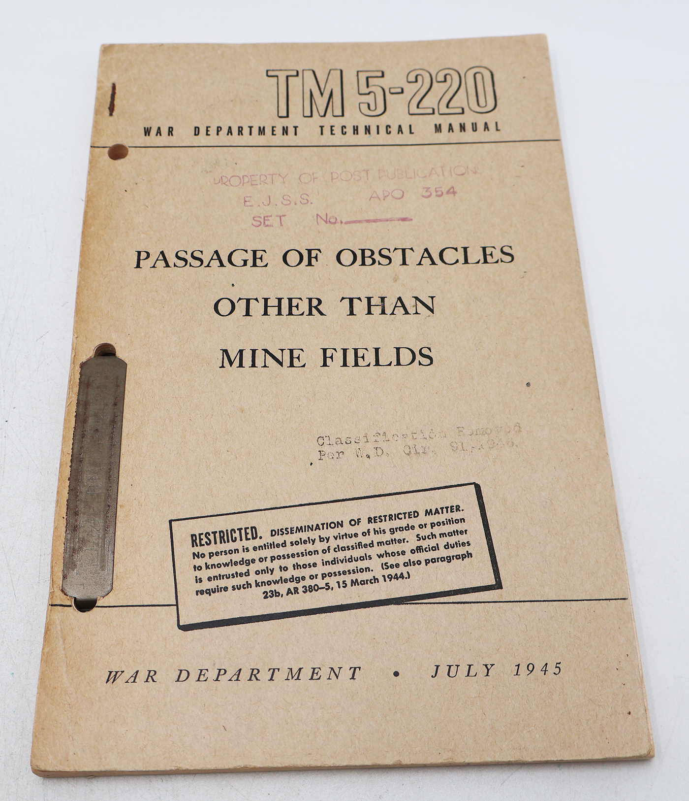 WWII US War Department Manual Handbook on Passage of Obstacles other than Mine Fields. Softbound. Dated 1945. Marked TM 5-220. 138 pages. Lots of photos and illustrations. Wear to the cover, but pages and binding are strong. No torn or missing pages.