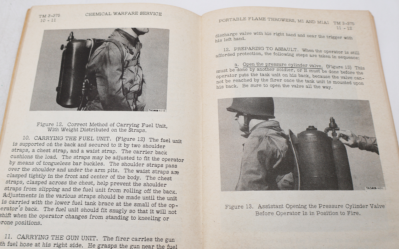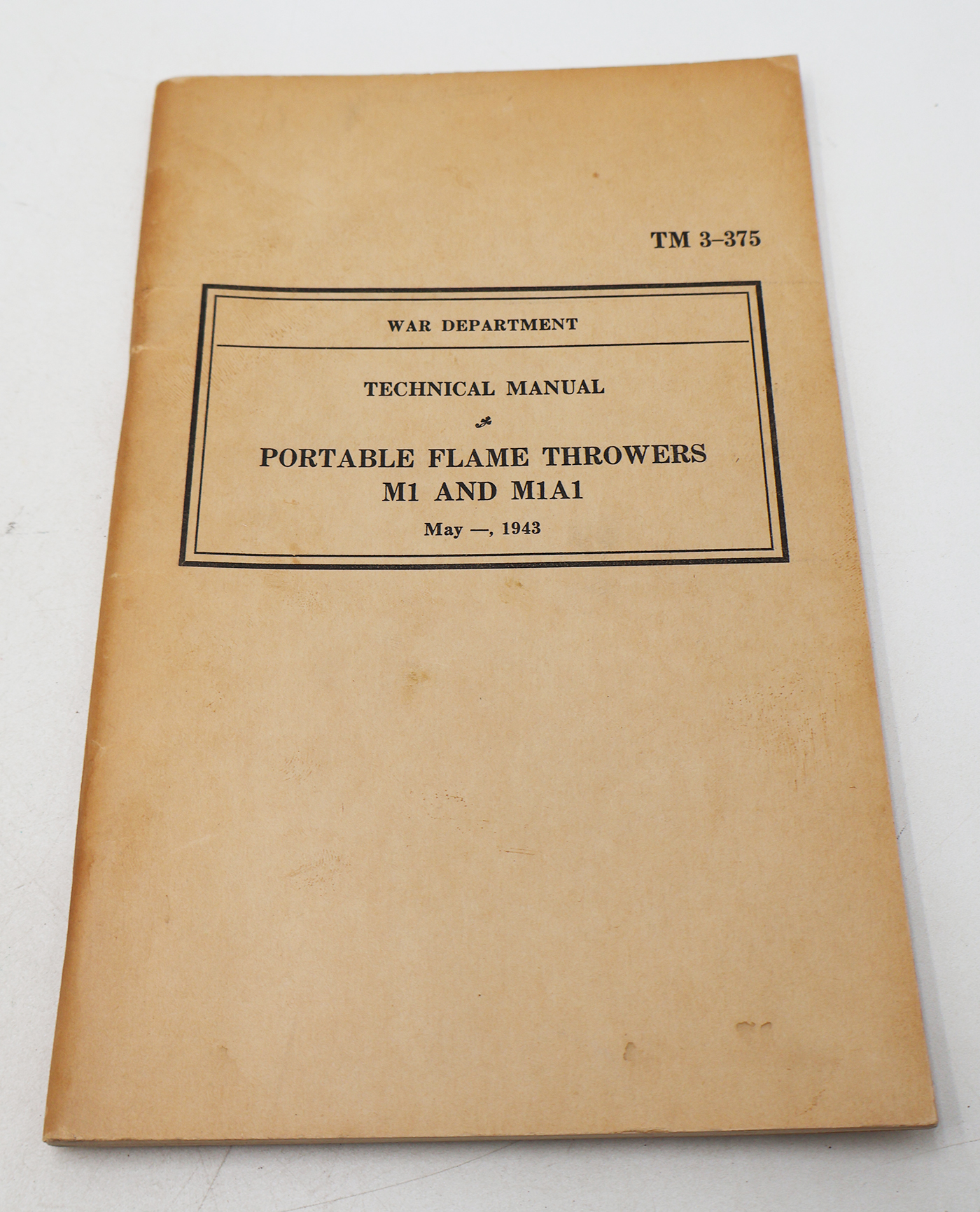 WWII US War Department Manual Handbook On Portable Flame Throwers M1 and M1A1. Softbound. Dated 1943. Marked TM 3-375. 123 pages. Lots of great illustrations and photos. Minor wear to the cover, but pages and binding are strong. No torn or missing pages.