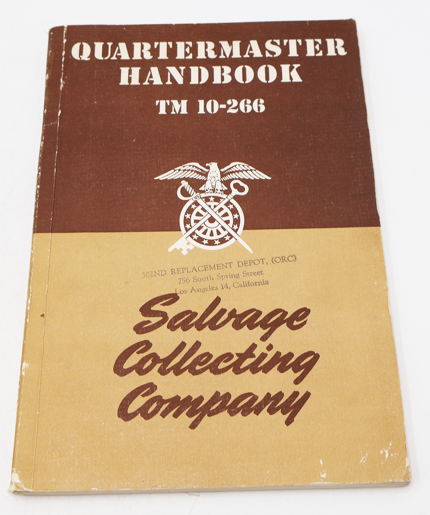 WWII Quartermaster Handbook On Salvage Collecting Company. Softbound. Dated 1944. Marked TM 10-266. 135 pages. Lots of great illustrations and photos. Wear to the cover, but pages and binding are strong. No torn or missing pages.