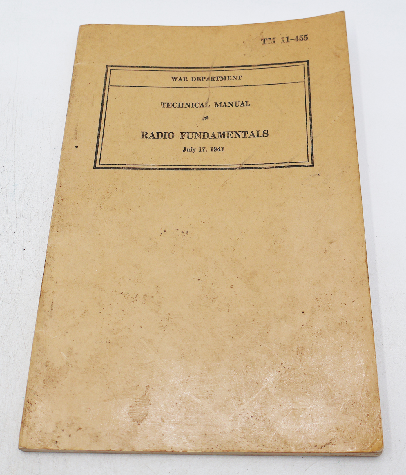 WWII US War Department Manual Handbook on Radio Fundamentals. Softbound. Dated 1941. Marked TM 11-455. 140 pages. Lots of illustrations. Notable wear to the cover, but pages and binding are strong. No torn or missing pages.