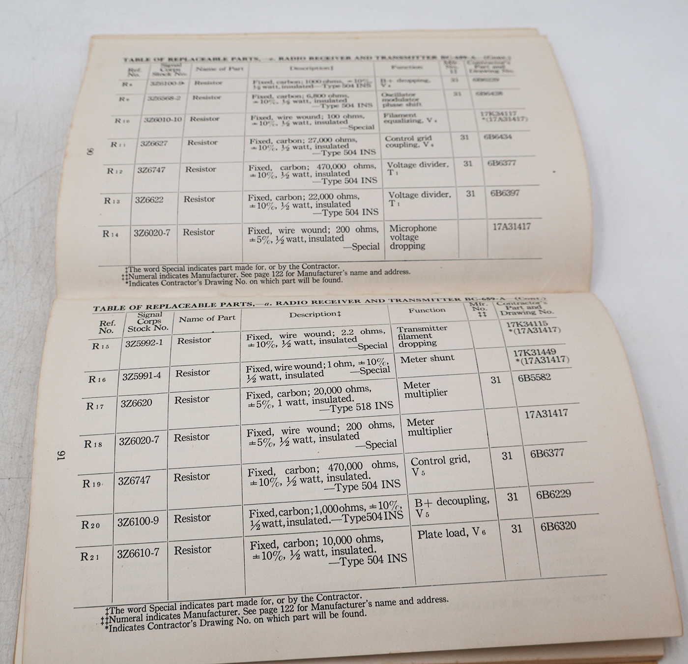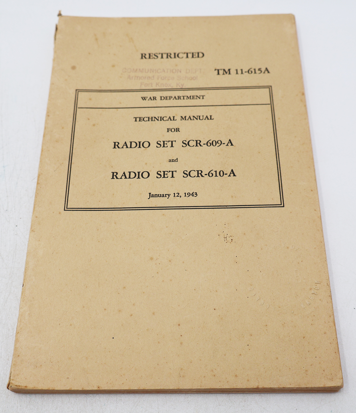 WWII US War Department Manual Handbook on Radio Set SCR-609-A, SCR-610-A. Softbound. Dated 1943. Marked TM 11-615A. 123 pages. Lots of illustrations. Notable wear to the cover, but pages and binding are strong. No torn or missing pages.