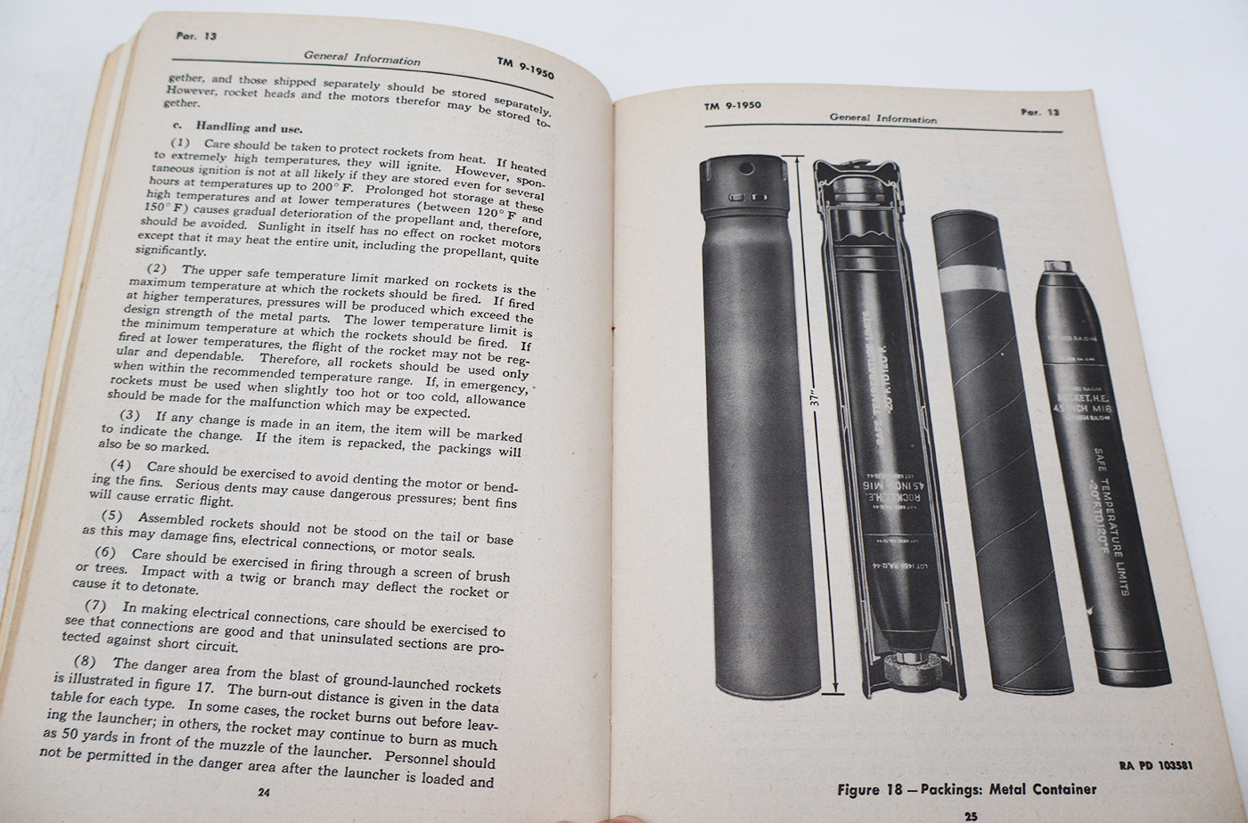 WWII US War Department Manual Handbook On Rockets. Softbound. Dated 1945. Marked TM 9-1950. 86 pages. Lots of great illustrations and photos. Wear to the cover, but pages and binding are strong. No torn or missing pages.