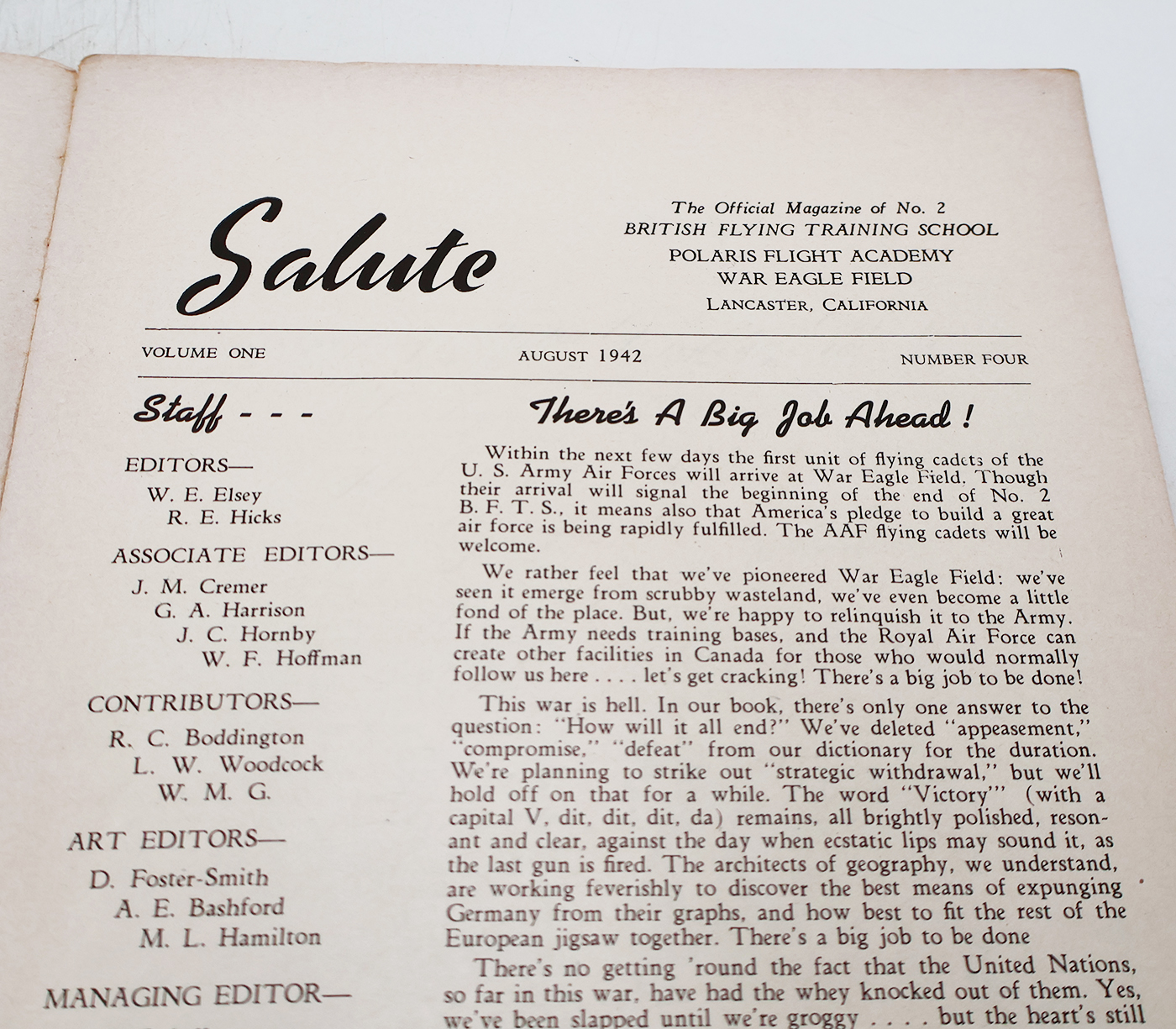 Salute Magazine. August 1942 dated. 32 pages. Lots of great illustrations and photos. The Official Magazine of No. 2, British Flying Training School, Polaris Flight Academy, War Eagle Field, Lancaster, California. Some notable wear to the cover, but the binding is still intact with no torn or missing pages.