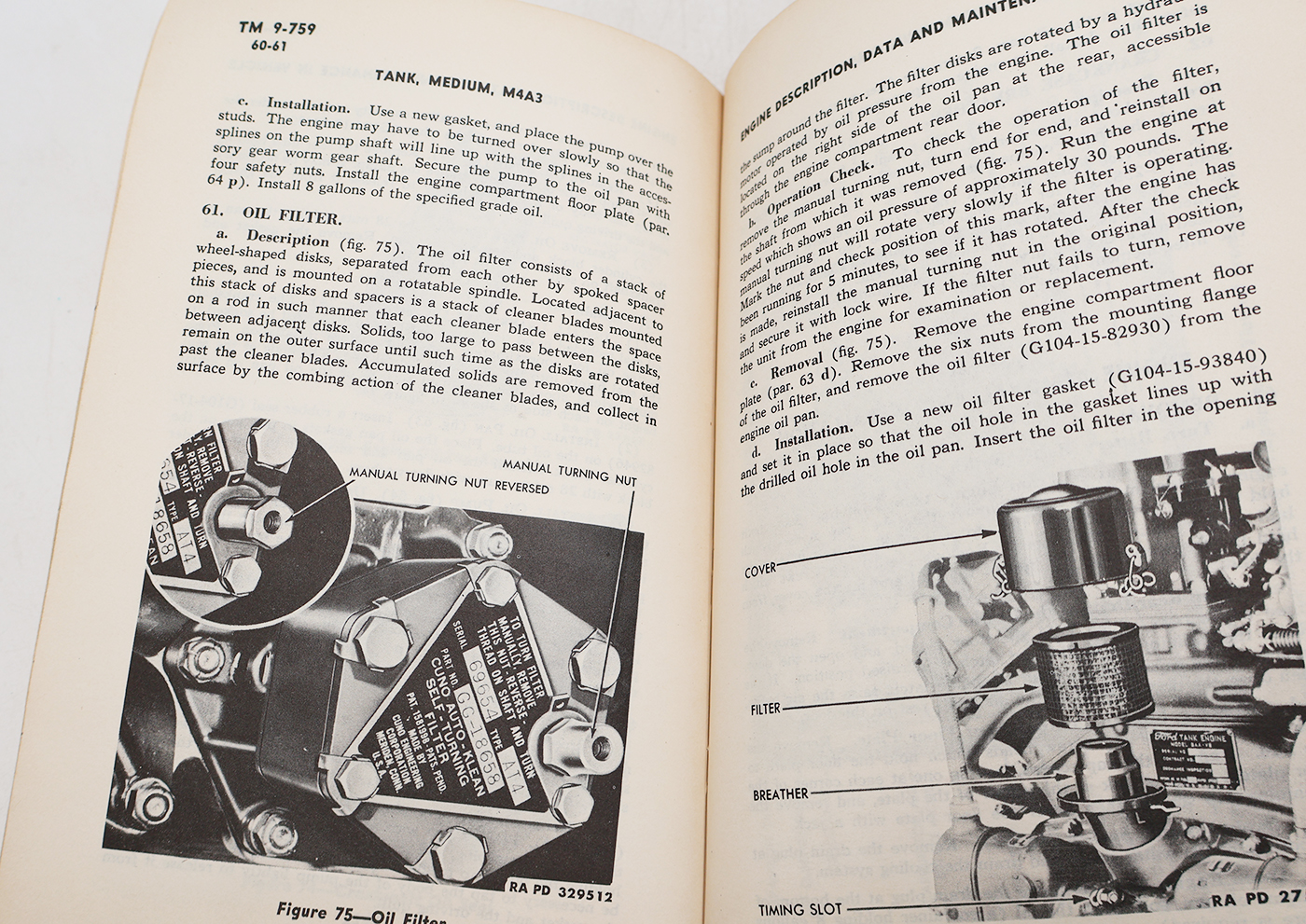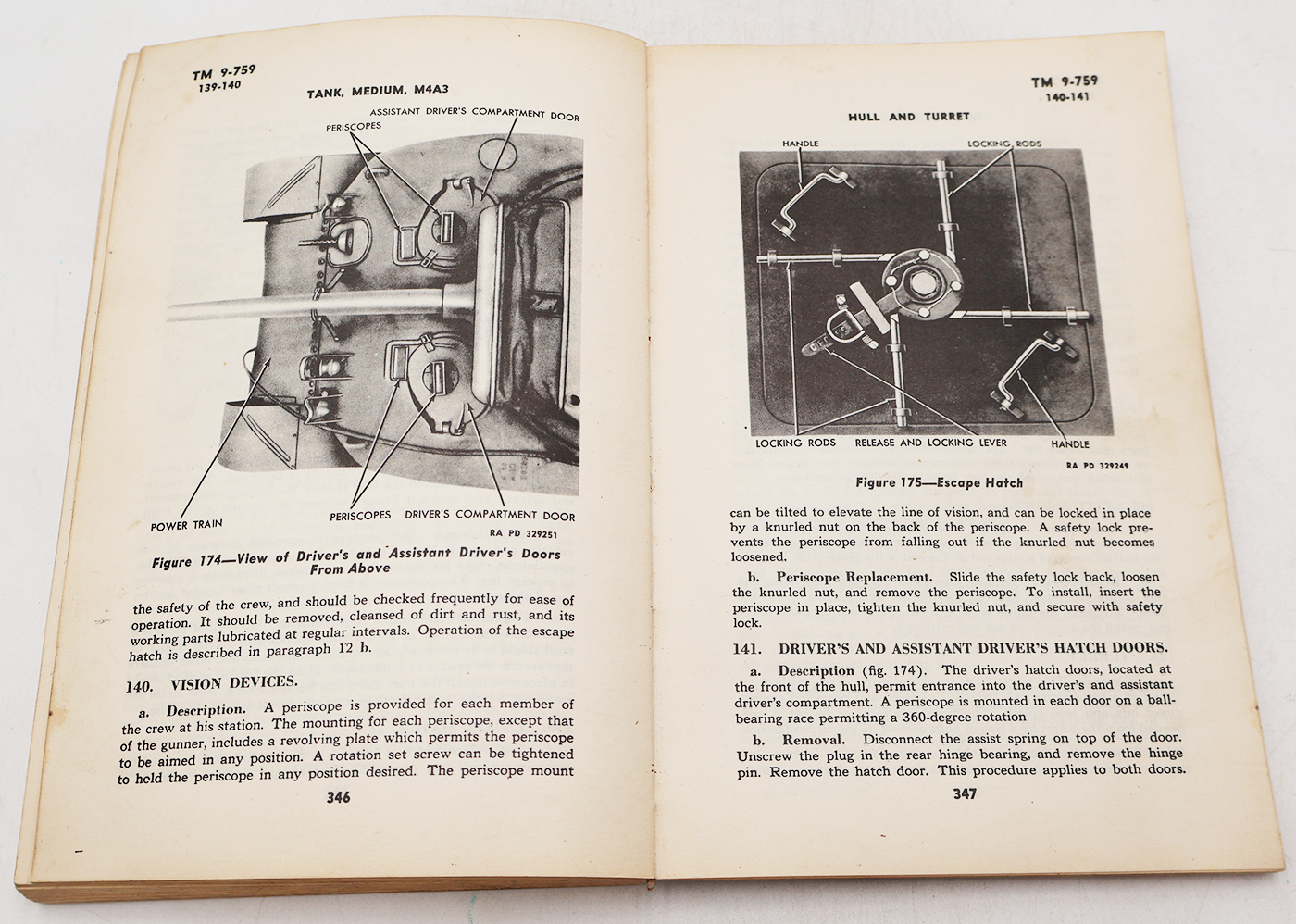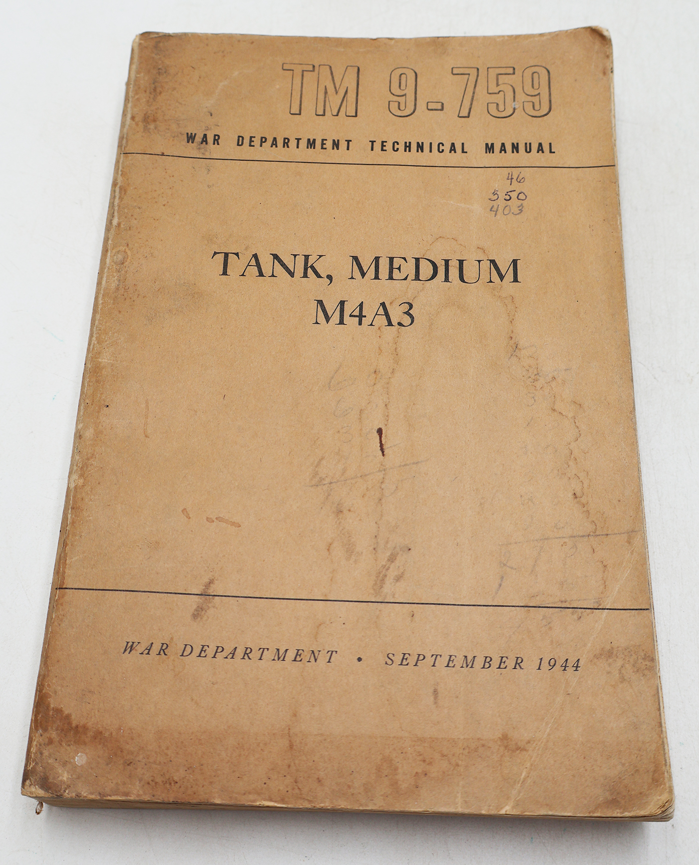 WWII US War Department Manual Handbook On Sherman Tank, Medium M4A3. Softbound. Dated 1944. Marked TM 9-759. 472 pages. Lots of great illustrations and photos. Cover is worn from age, but pages and binding are in good condition. No torn or missing pages.