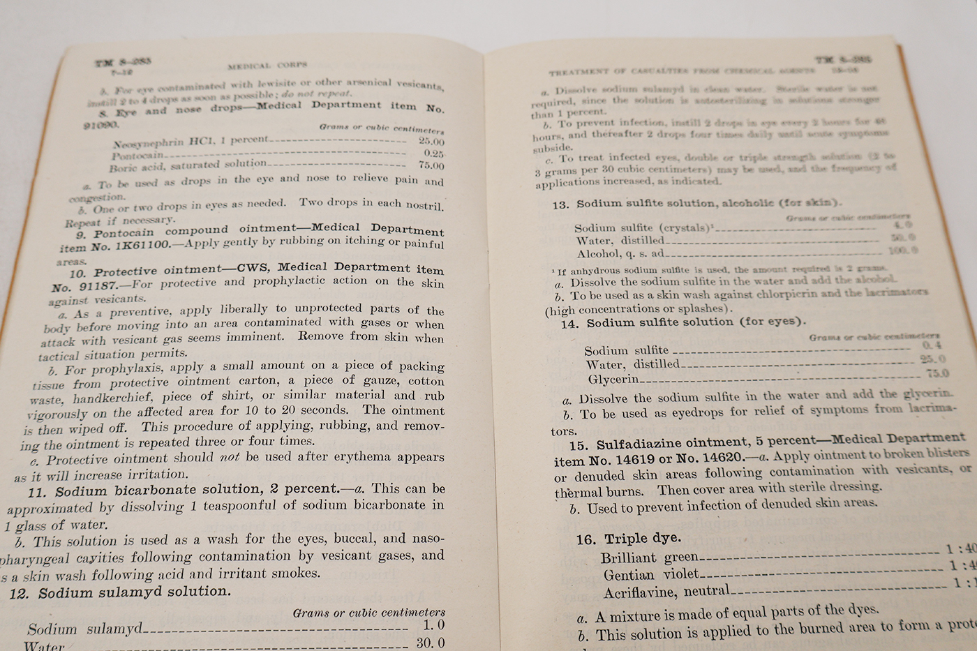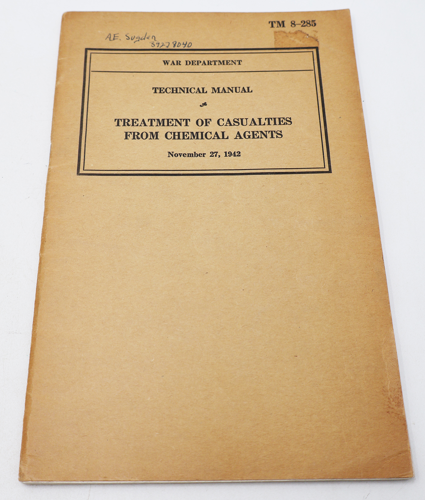 WWII US War Department Manual Handbook On Treatment of Casualties From Chemical Agents. Softbound. Dated 1942. Marked TM 8-285. 76 pages. Minor wear to the cover, but pages and binding are strong. No torn or missing pages.