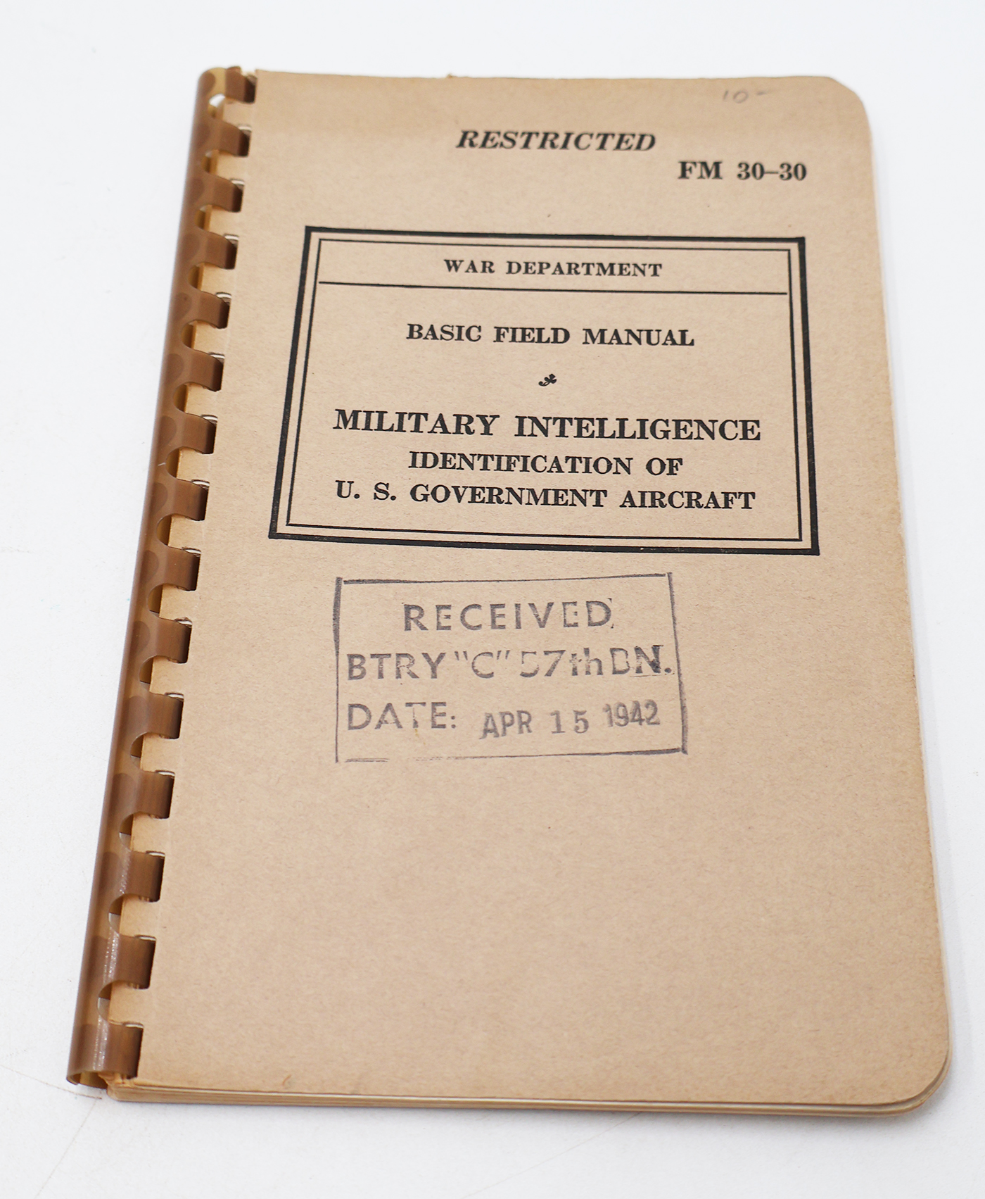 WWII US War Department Manual Handbook On US Aircraft Identification. Softbound. Dated 1941. Marked FM 30-30. 92 pages. Lots of great illustrations and photos. Wear to the cover, but pages and binding are strong. No torn or missing pages.