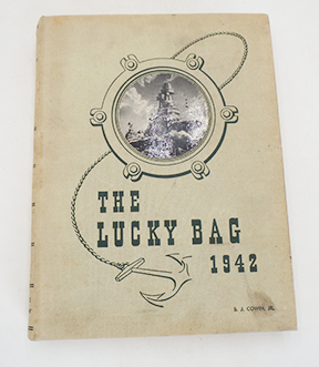 US Naval Academy Lucky Bag Yearbook Dated 1942. In good condition with just some minor wear around the edge of the cover and some of the pages. Good binding, clean body and no torn or missing pages. Features Michael R. Pessolano, whom was lost when the USS Indianapolis was sunk. 519 pages with B/W photography.