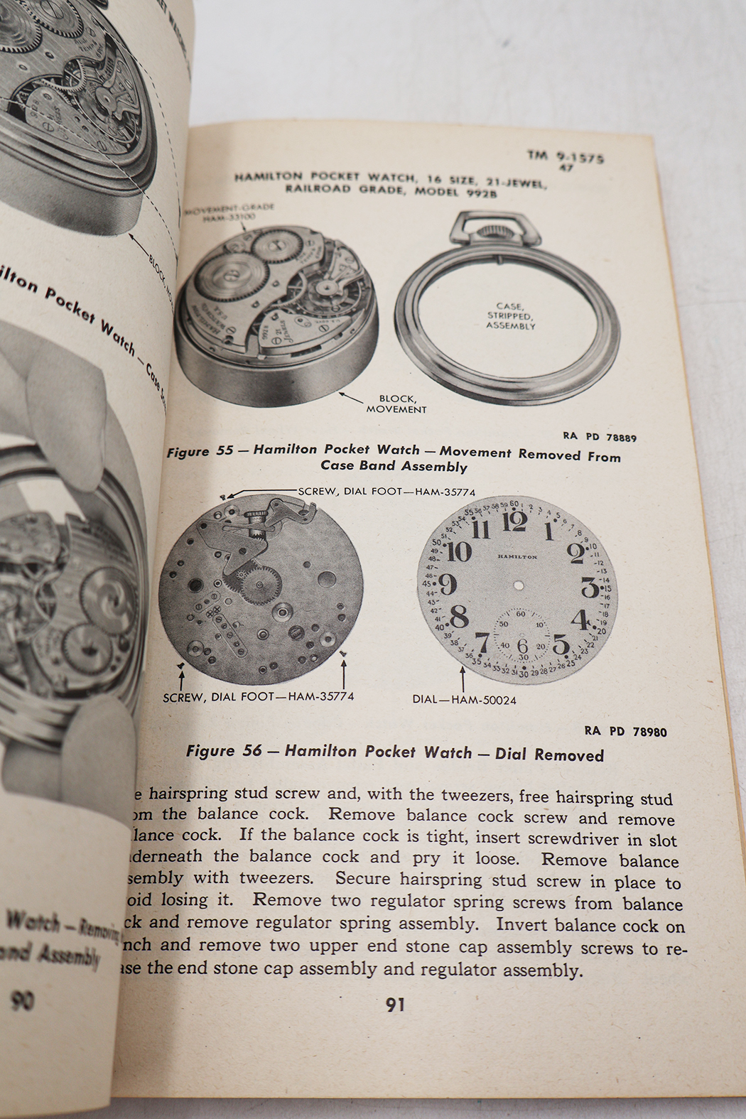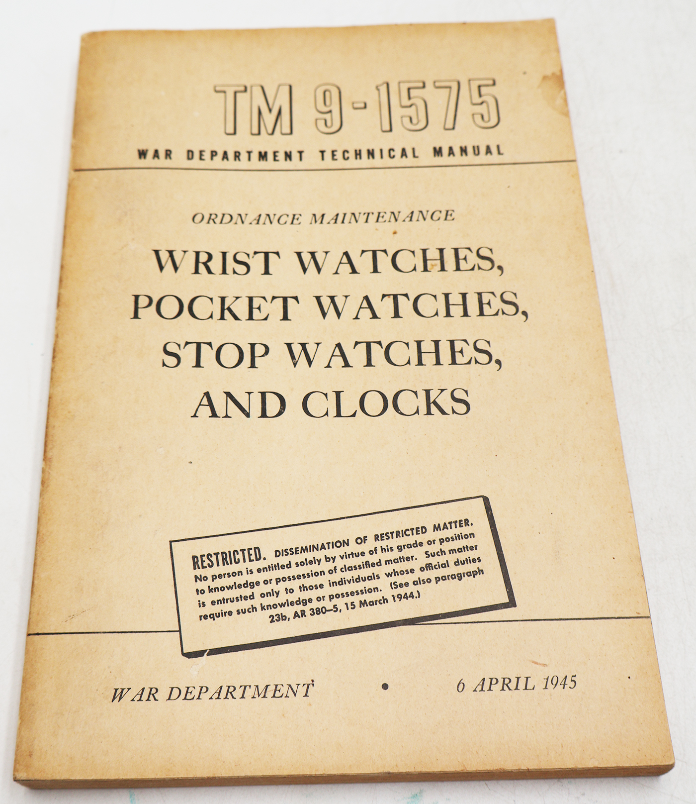 WWII US War Department Manual Handbook On Wrist Watches, Pocket Watches, Stop Watches, And Clocks. Softbound. Dated 1945. Marked TM 9-1575. 222 pages. Lots of great illustrations and photos. Minor wear from age. No torn or missing pages.