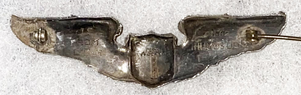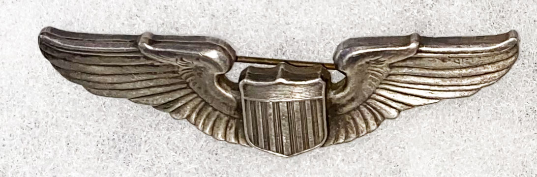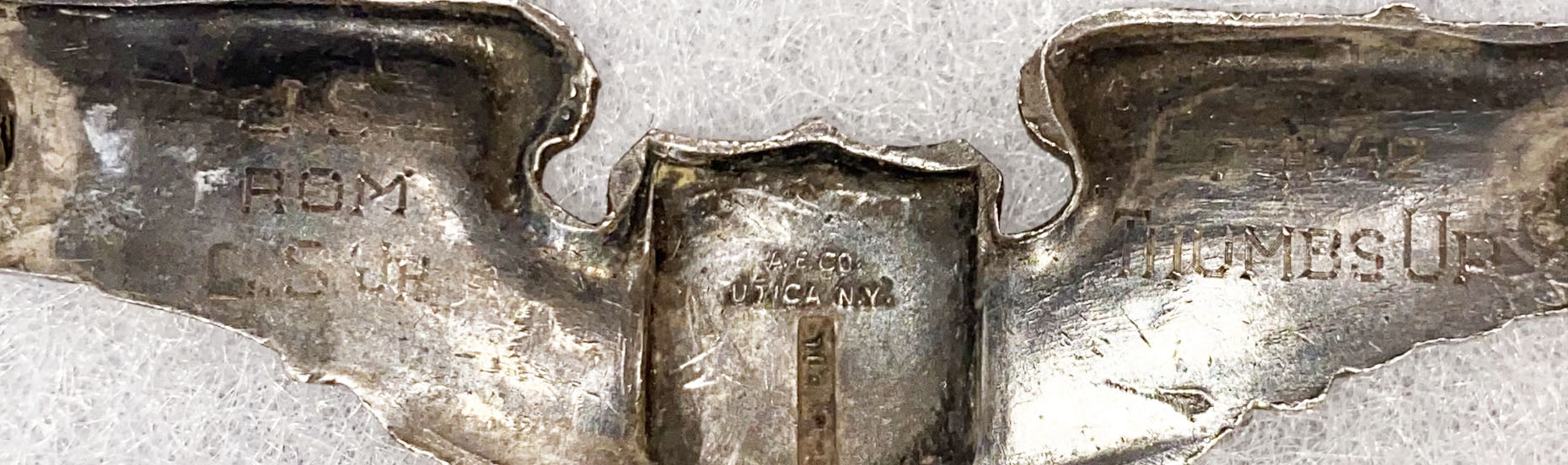 WWII Army Air Forces Engraved Pilot Wing. Three inches long. Made by A&E Co. Hand engraved on reverse is JS FROM CS 7-11-72 THUMBS UP. Pin back.