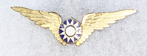1945-1949 Nationalists Chinese / KMT Air Force 5th Training Class Special Pilots Wing. About two and a half inches wide. Gold colored wings with killer feathered details. The center section is an enameled applied sun. Has a very short pin assembly, about an inch wide. There are raised Chinese characters that roughly translate to 5TH TRAINING CLASS SPECIAL. Show very minor wear.