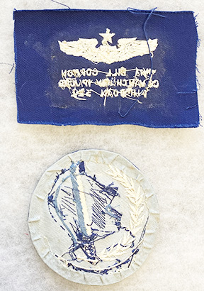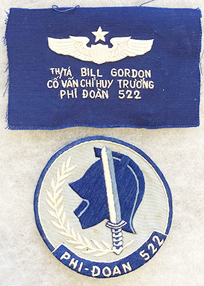Vietnam US Air Force 522nd Fighter Squadron US Advisor To VNAF Patch Set. Two pieces. The 520th fighter squadron patch is Vietnamese hand embroidered and unused. The cloth name tag has a Vietnamese hand emb. Command pilot wing with TH/TA BILL GORDON CO VAN CHI HUY TROUNG PHI DOAN 522 below. It is unused also. Great set of insignia.