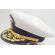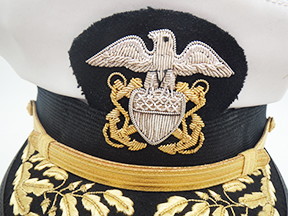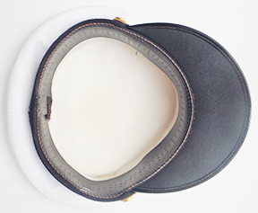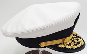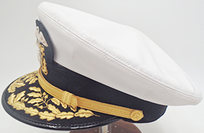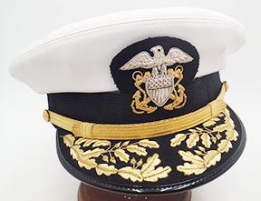 Vietnam era Navy Admiral's White Visor Cap. Made of white rubberized material. Attached to the front is a bullion navy insignia which is clean and in good condition. Hat maker is unknown. Hat is labelled a size 7 1/4. Material is in solid condition with no holes. The leather bill is clean and in good condition.
