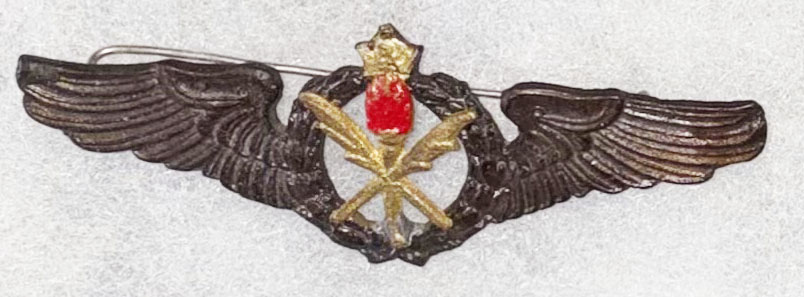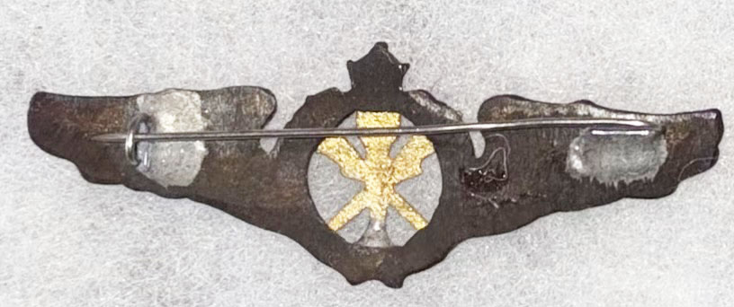 Shah Period Iranian Air Force Torch & Feathers Wing. Three inches long. Has crossed feathers and torch design in the center. Two tone metal finish. Pin back.