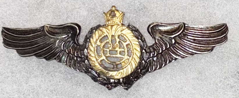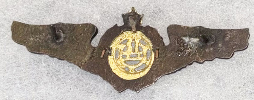 Shah Period Iranian Air Force Wing. Three inches long. Has crossed brass design in the center. Two tone metal finish. Clutch back.