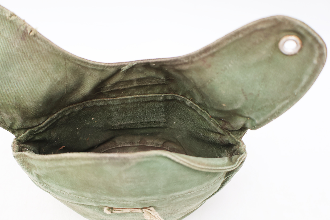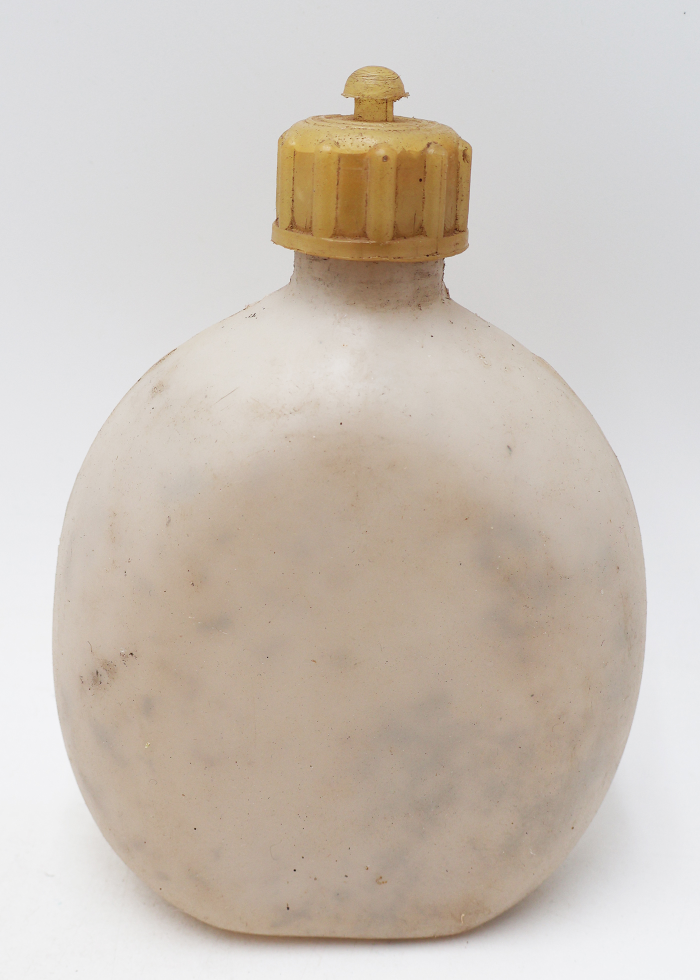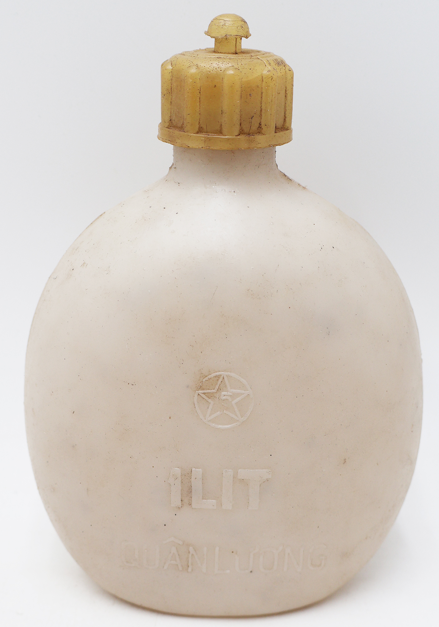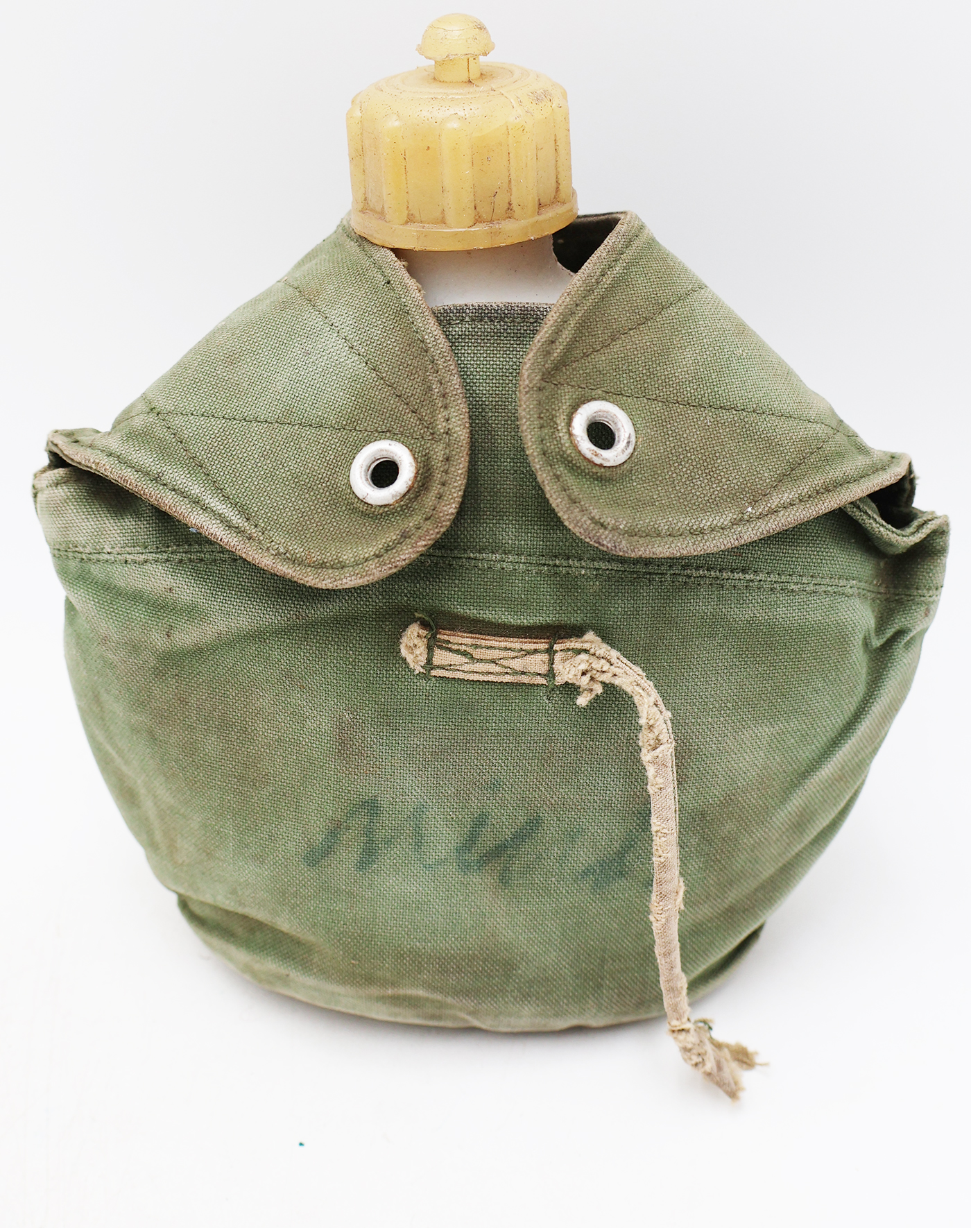 Wartime Vintage North Vietnamese / NVA Plastic Canteen With Green Cloth Cover. White plastic body with a beige canteen cap. Still in it's original cotton, machine sewn cover. One tie string has broken off. Has soldiers name in ink across the front. Has a great look.