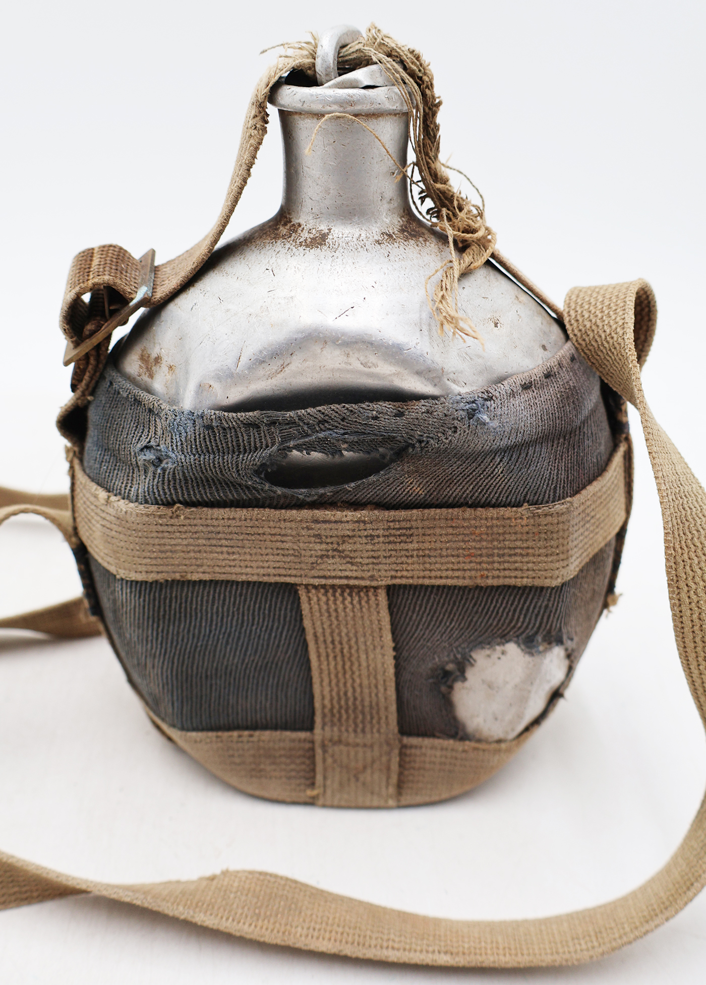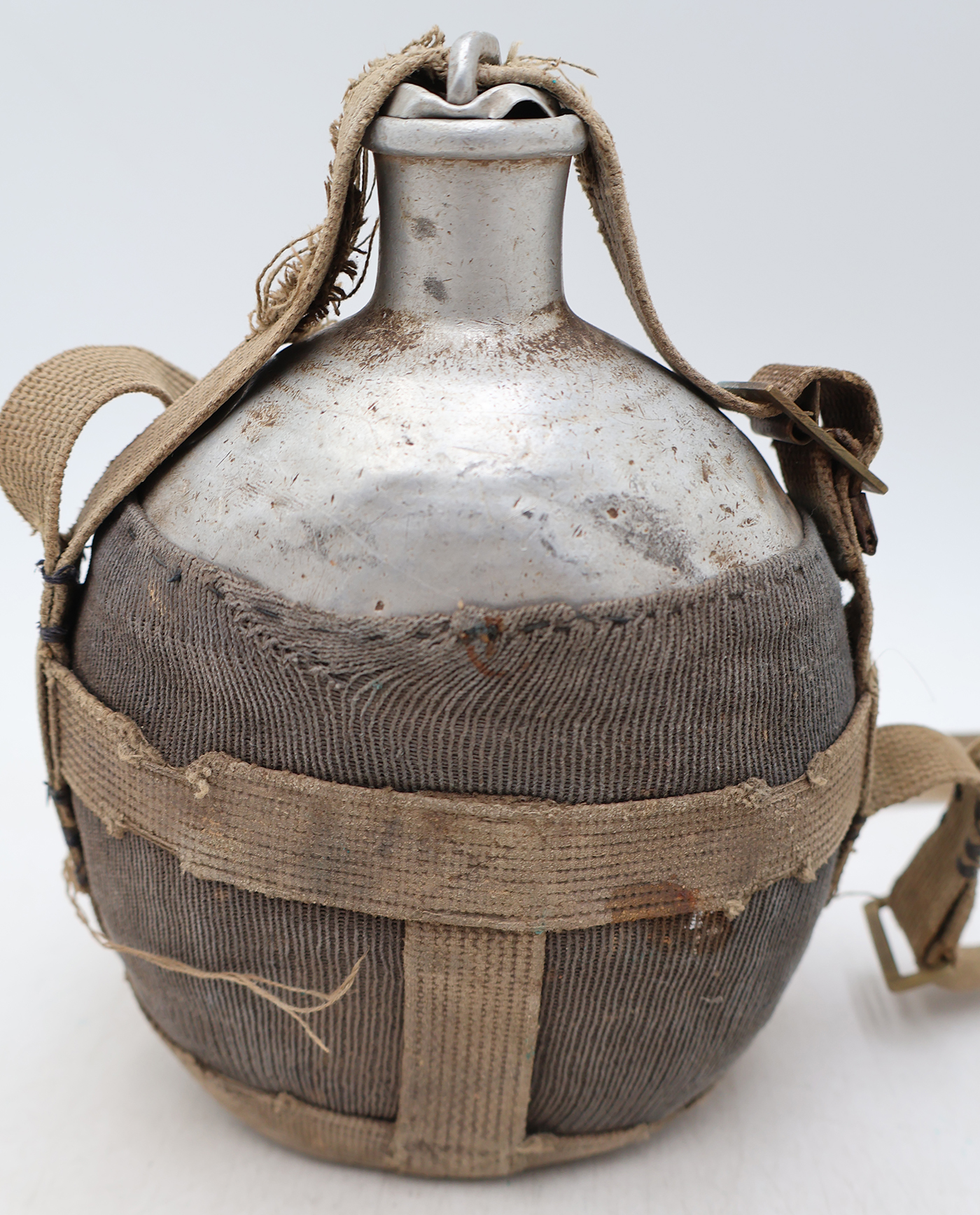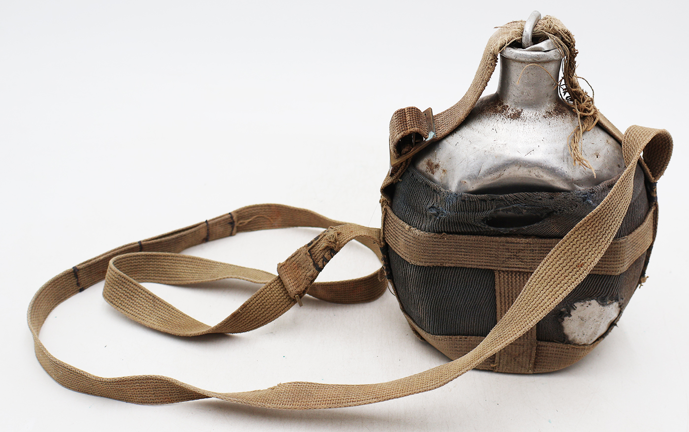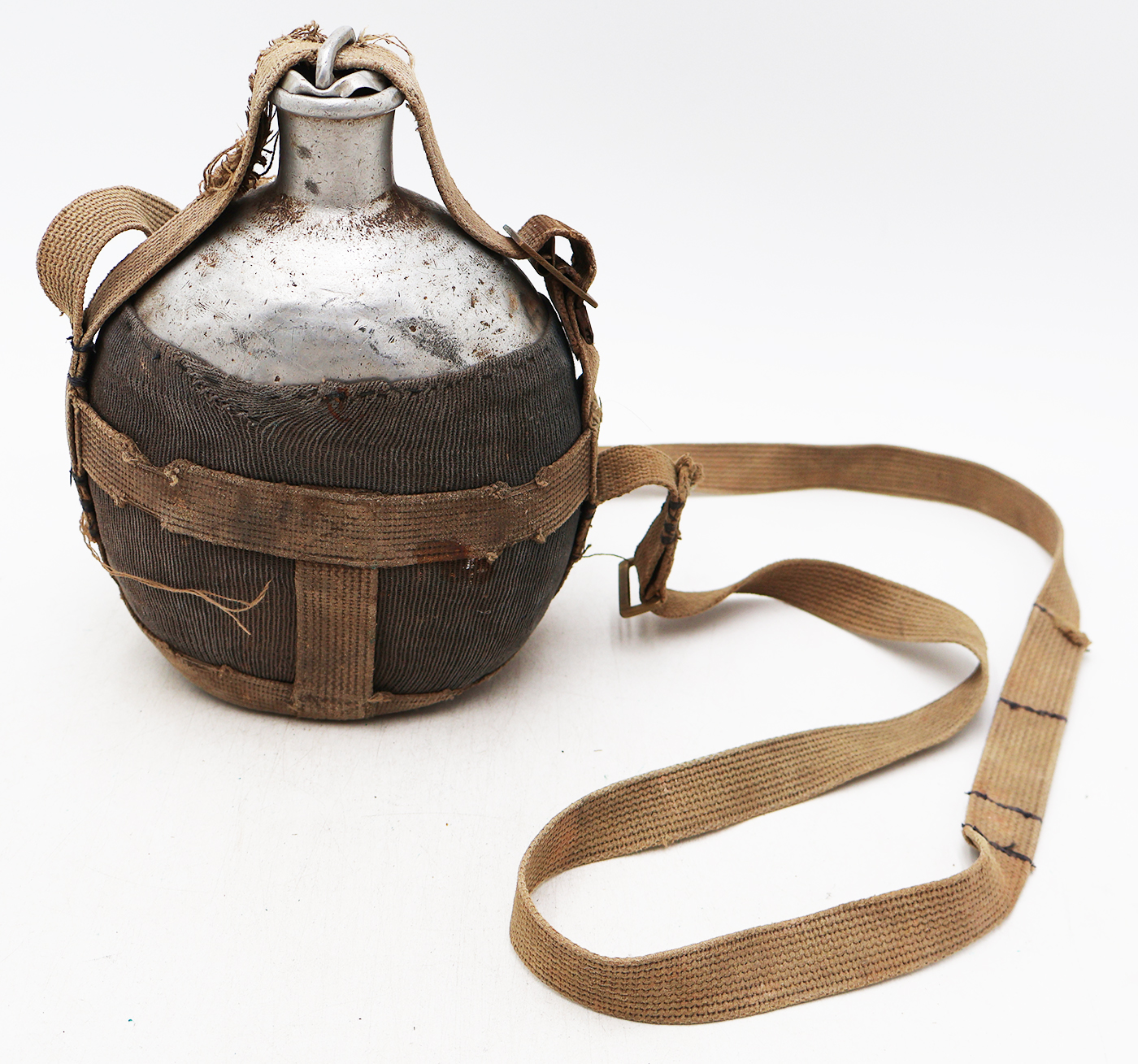 Wartime Vietnam North Vietnamese Army / NVA Odd Metal Canteen. Standard issue metal canteen that shows a small amount of original paint on it. What is unusual is there is a sort of knit covering to help with insulation. Also has the standard skeletal canvas carrier. Has been well used and is a cool variant.
