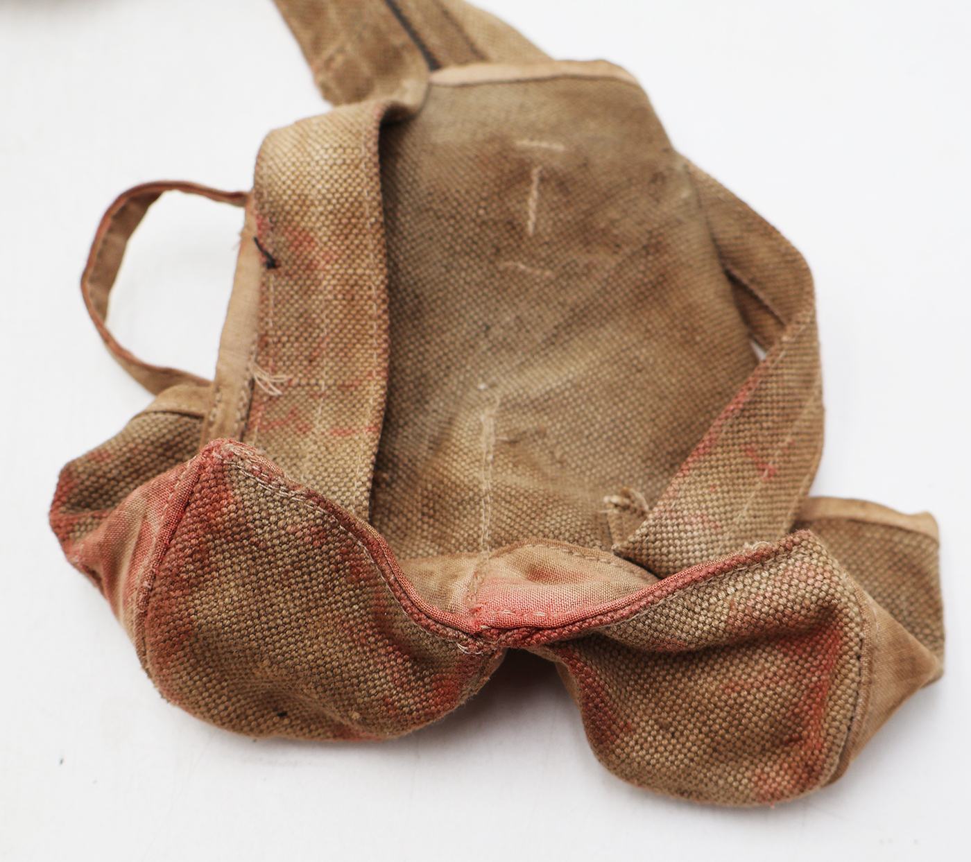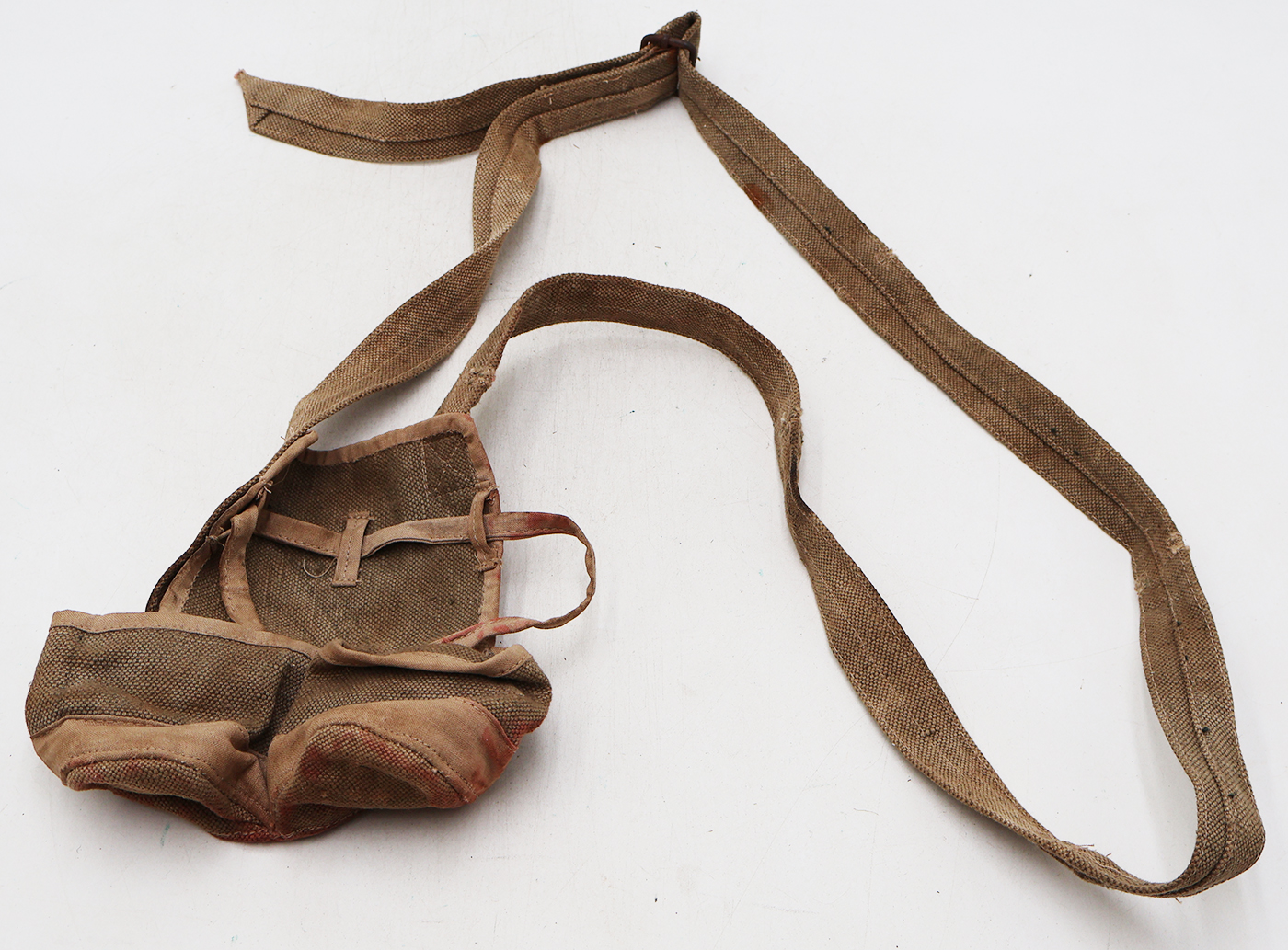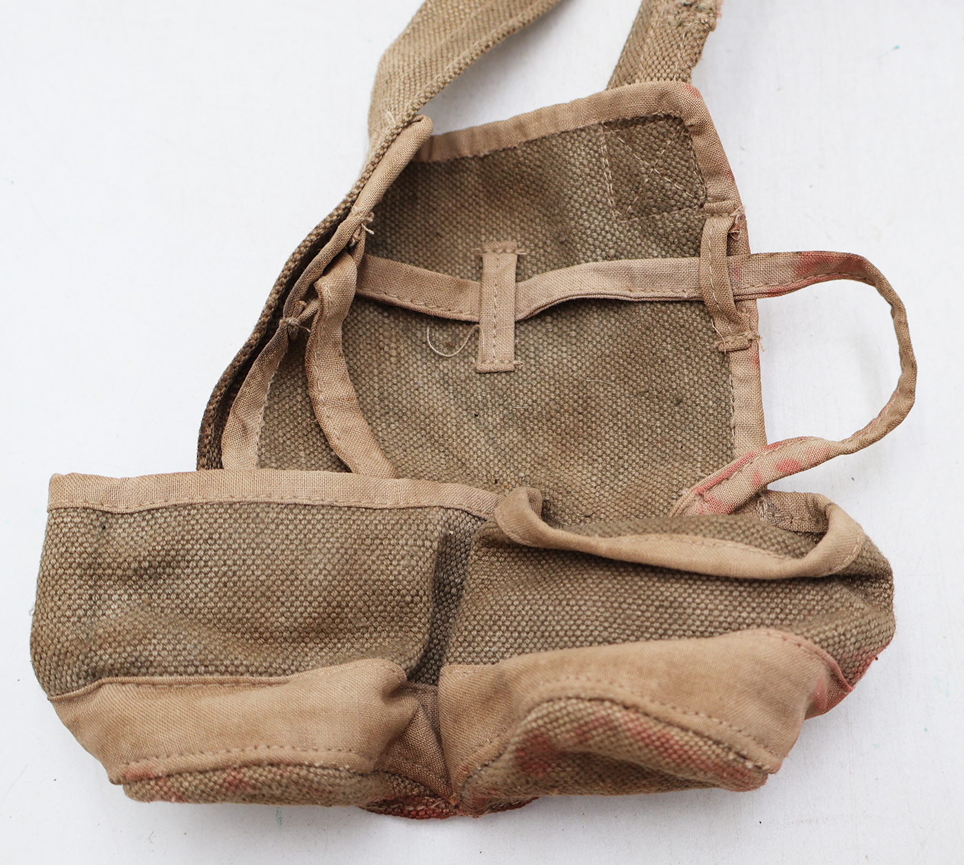 Wartime Vietnam North Vietnamese Army / NVA Two Cell Grenade Pouch. Khaki canvas two toned body. Still has the tie down strings. Has been well used and stained.