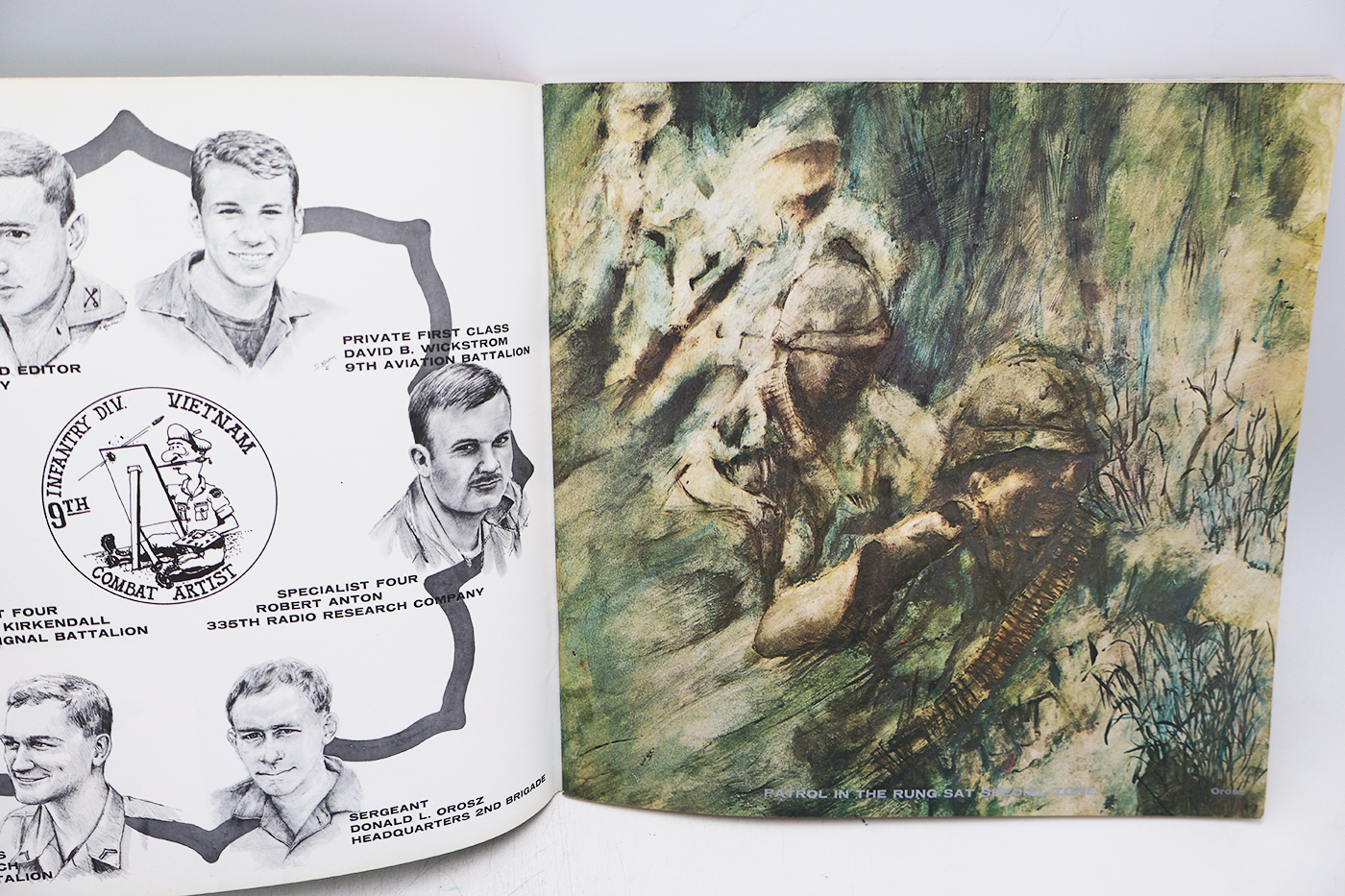 Vietnam era 9th Infantry Division Vietnam: Combat Art and Photography Book. The book cover and pages have minor wear. Lots of Photos and illustrations. The binding is strong. No torn or missing pages. The book is 1968 dated. The book contains approx. 60 pages.