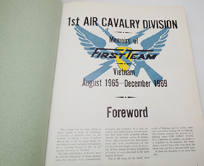 Vietnam era "The First Team" 1st Air Cavalry Division in Vietnam August 1965 to December 1969 Unit History. The book cover and pages are worn with age, but the binding is strong. No torn or missing pages. The book is 1970 dated. First Edition. Well Illustrated. The book contains approx. 296 pages.