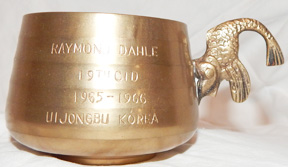 Vietnam Era 19th Criminal Investigation Detachment SPOOK Brass Mug. Korean made, short brass muc. Has a fish body as a handle. On one side is a Korean made enameled 1st corps patch and next to that is an enameled ASA / MI Spook badge. Engraved on the other side is RAYMOND DAHLE 19TH CID 1965-1966 UIJONGBU KOREA. Looks barely used.