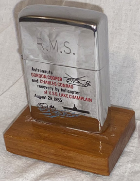 Vietnam Era Apollo Spacecraft Recovery Cigarette Lighter. Zippo style with a polished finish. Factory engraved on front is ASTRONAUTS GORDON COOPER AND CHARLES CONRAD RECOVERY BY HELICOPTER OF USS LAKE CHAMPLAIN AUGUST 29, 1965. Also has a helicopter, space capsule floating at sea and a carrier in background. Has privately engraved initials R.M.S. Appears lightly used. Non-branded style. Has been a fixed to a small wooden base. Even though its not a Zippo it is still a killer piece.
