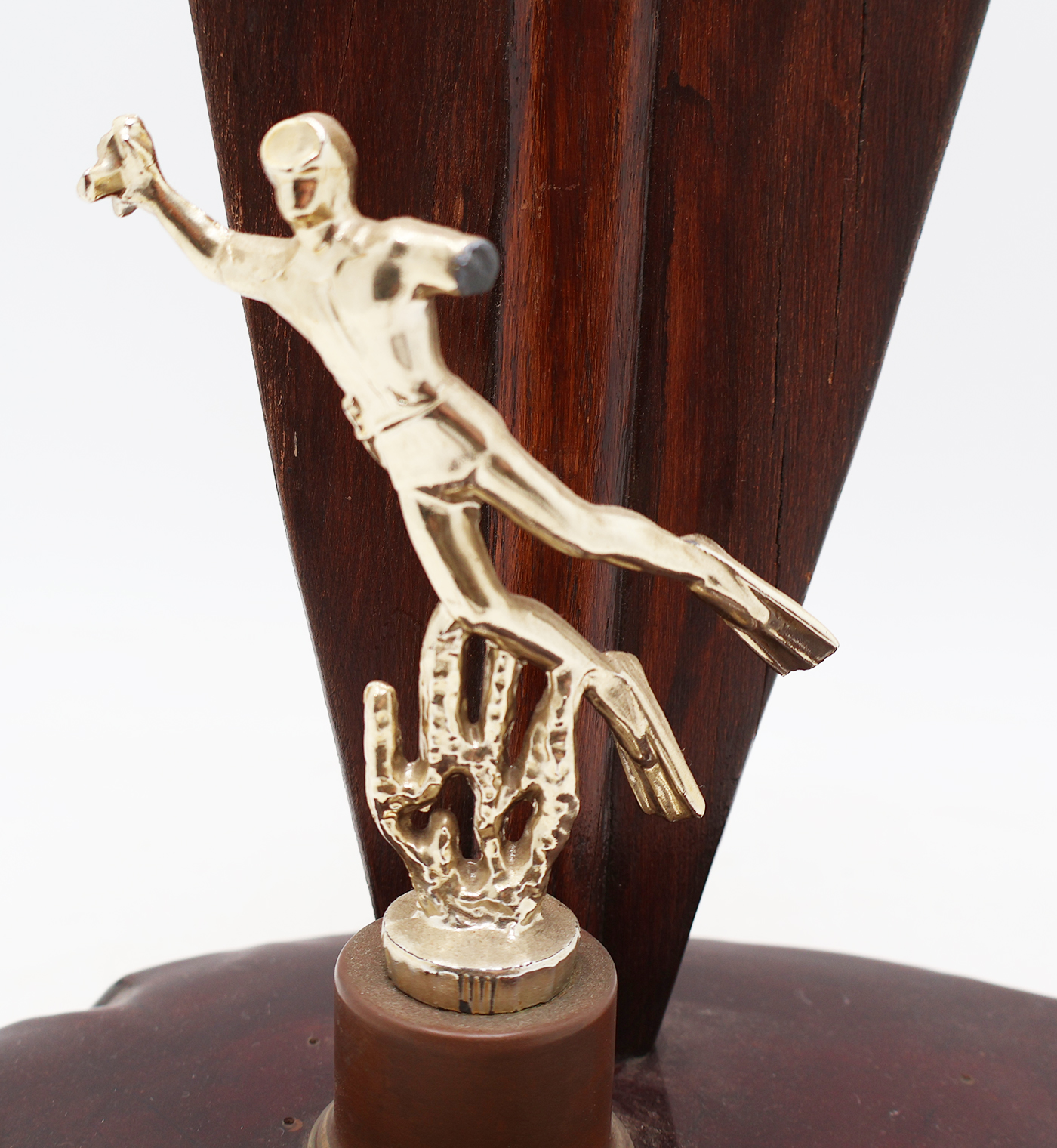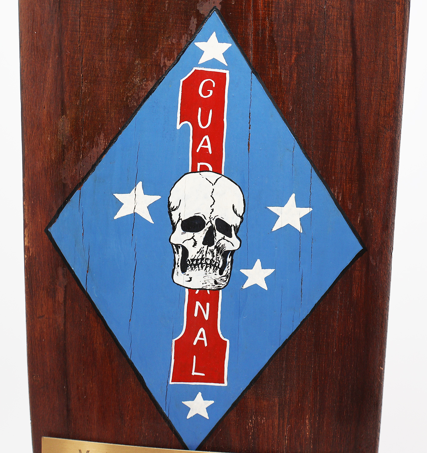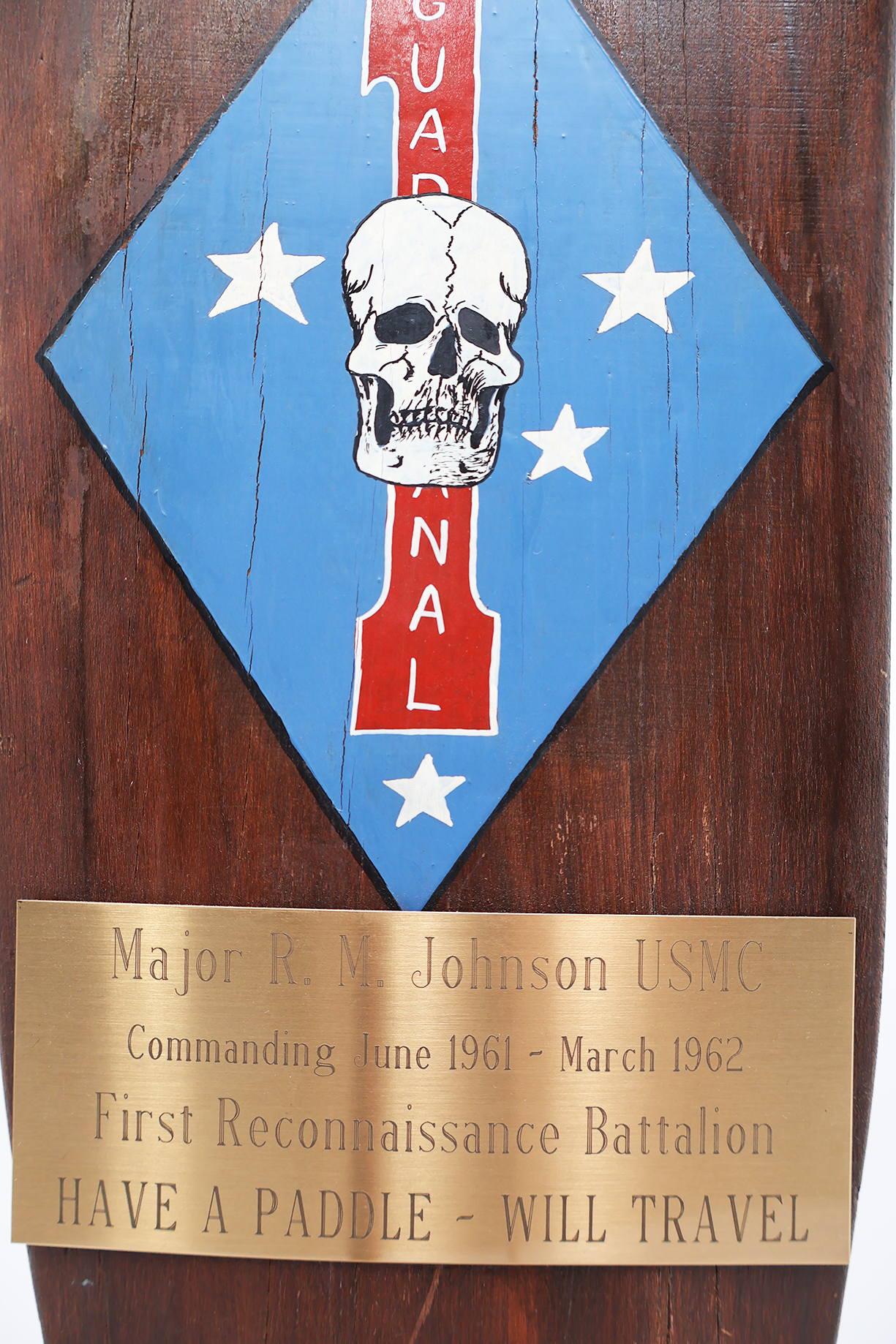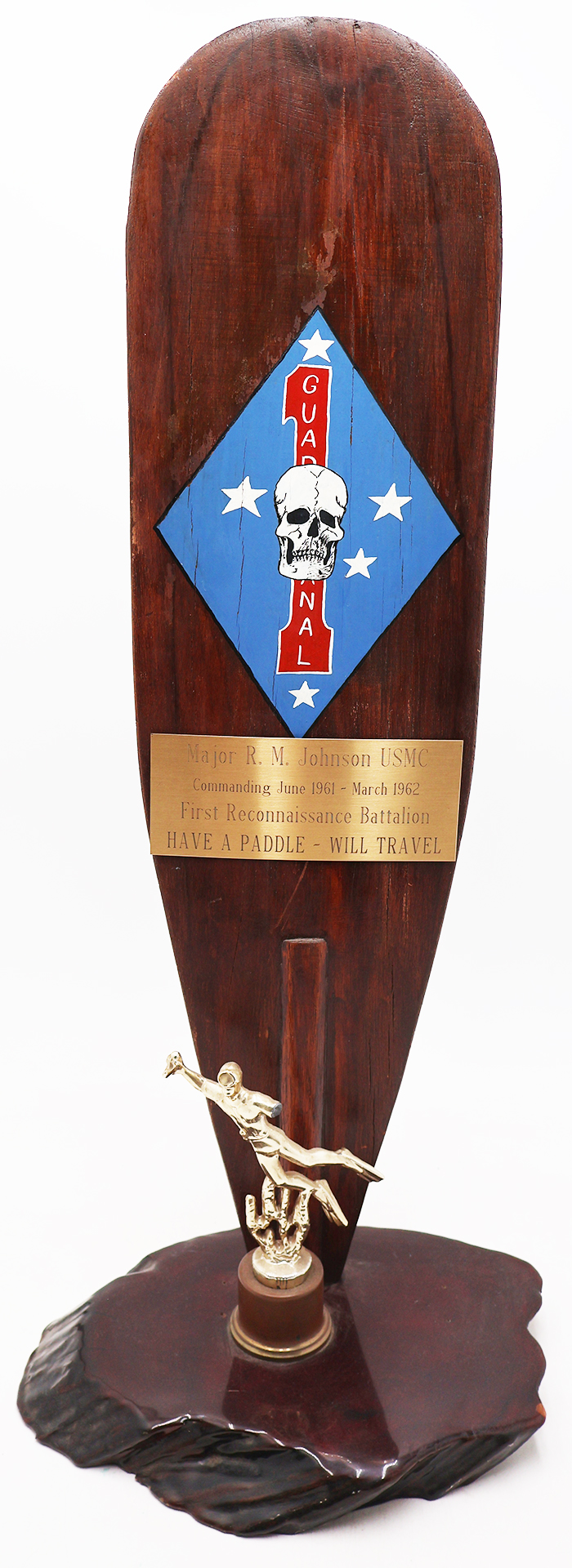 Vietnam era USMC 1st Force Recon Commanding Officer Retirement Plaque. Part of an UDT type oar screwed into a wooden base. Has a small cast figure of a diver. Diver is in good condition, but is missing the left arm (see photos). On the oar is painted the early unit insignia with the name of the Major whom the plaque is presented too on a brass plate. Measures 27 inches in height. Some minor wear from storage, overall in good condition. To help with shipping, the oar will be unscrewed from the base when packed.