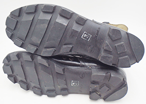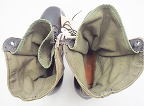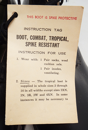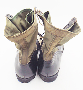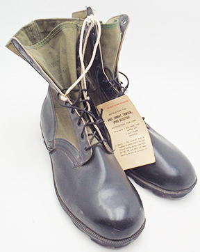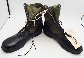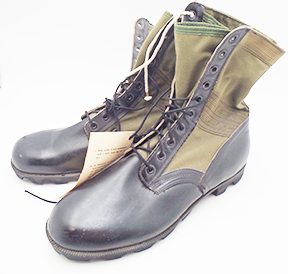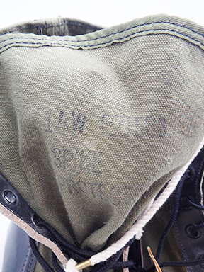 Dead Stock 3rd Model Jungle Boots Size 14W. Standard black leather bottoms with the canvas uppers. This is the version with the ankle re-enforcing. Dated 5-1968. Marked a size 14W. The soles are made by Bata. Very clean with just some very minor wear from storage that can be polished off. These have never even been tried on by anyone.
