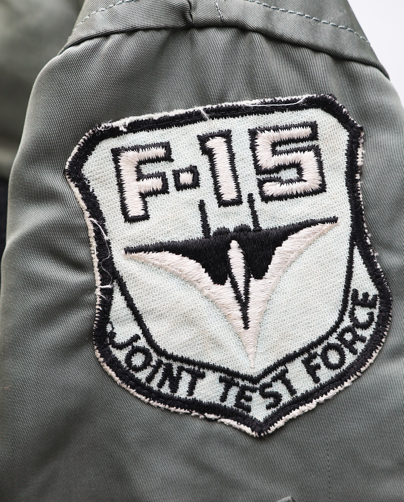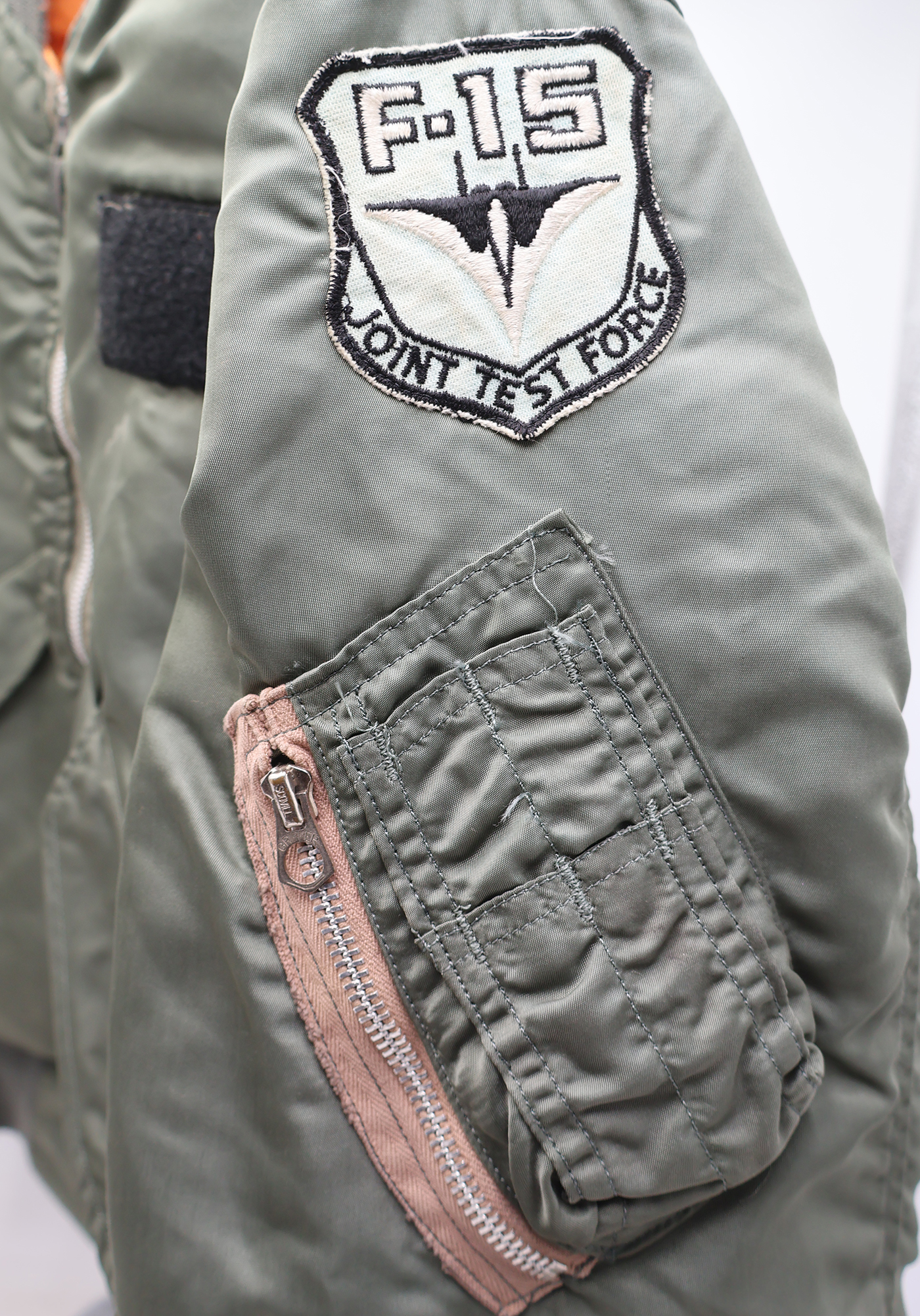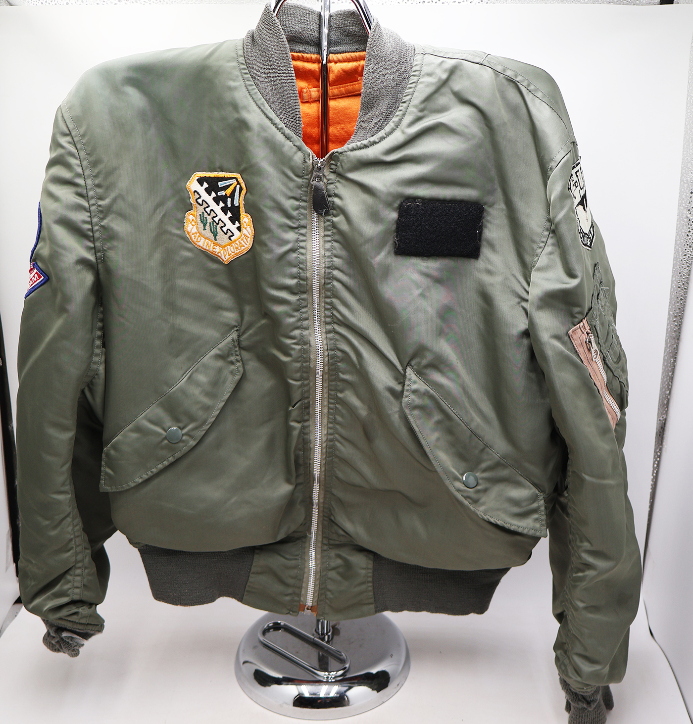 Vietnam era F-15 Test Pilot L-2B Flight Jacket. 1972 dated. All of the insignia is US made. F-15 Joint Test Force patch on the left sleeve, Test flight center on the chest and Climate Test Team on the right sleeve. Jacket is in good condition with some wear. Some wrinkles from storage. The SCOVILL zipper works well. The lining is in good shape. The knit cuffs and base of the jacket have some holes (see photos). Jacket is labelled a size medium. Jacket measures shoulder to shoulder 19 inches, front chest size 19 inches, sleeve length 23 inches and top of the neck to the base of the jacket is 25 inches.