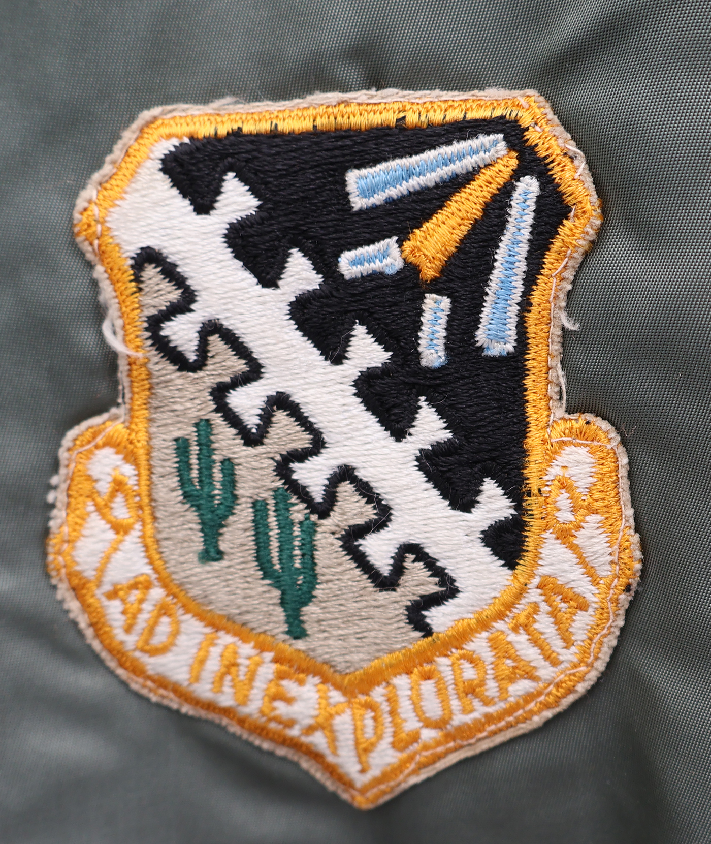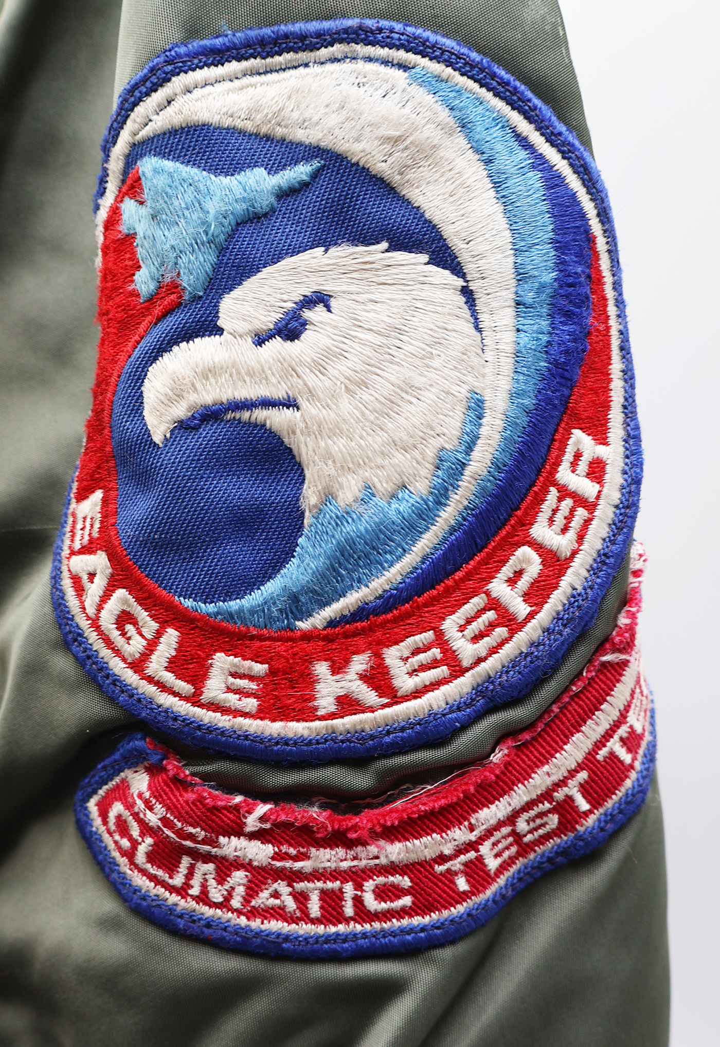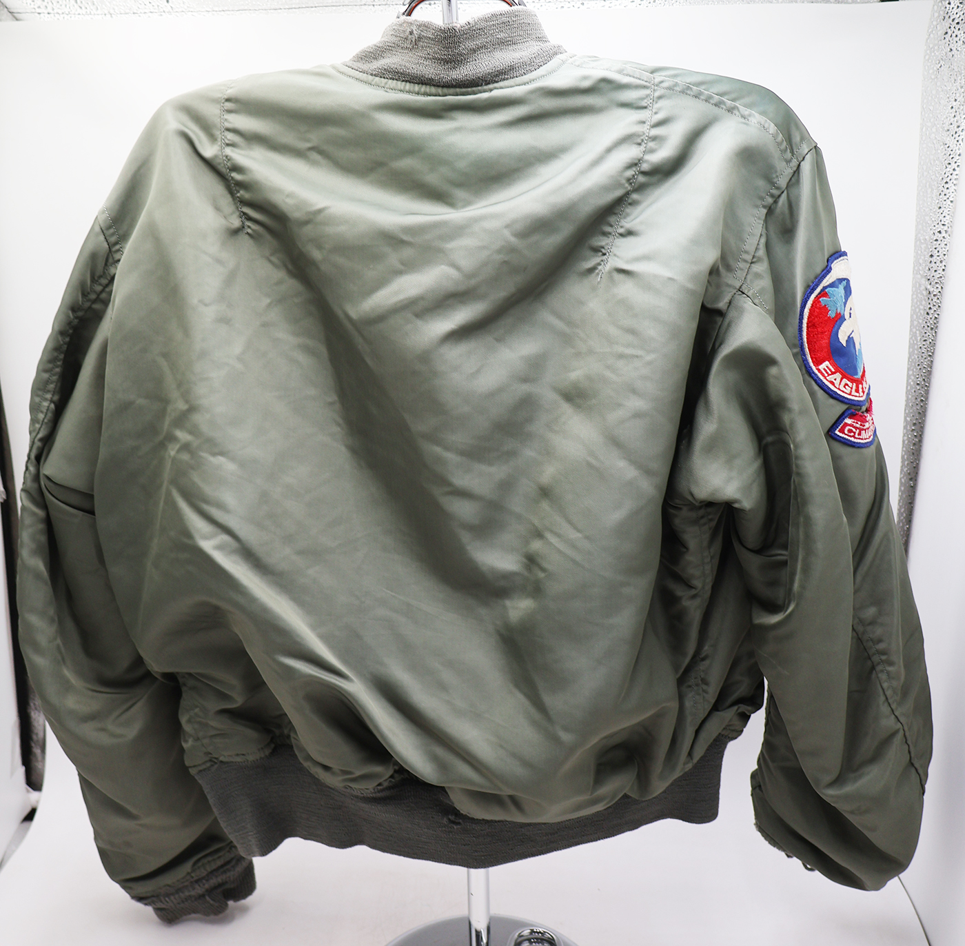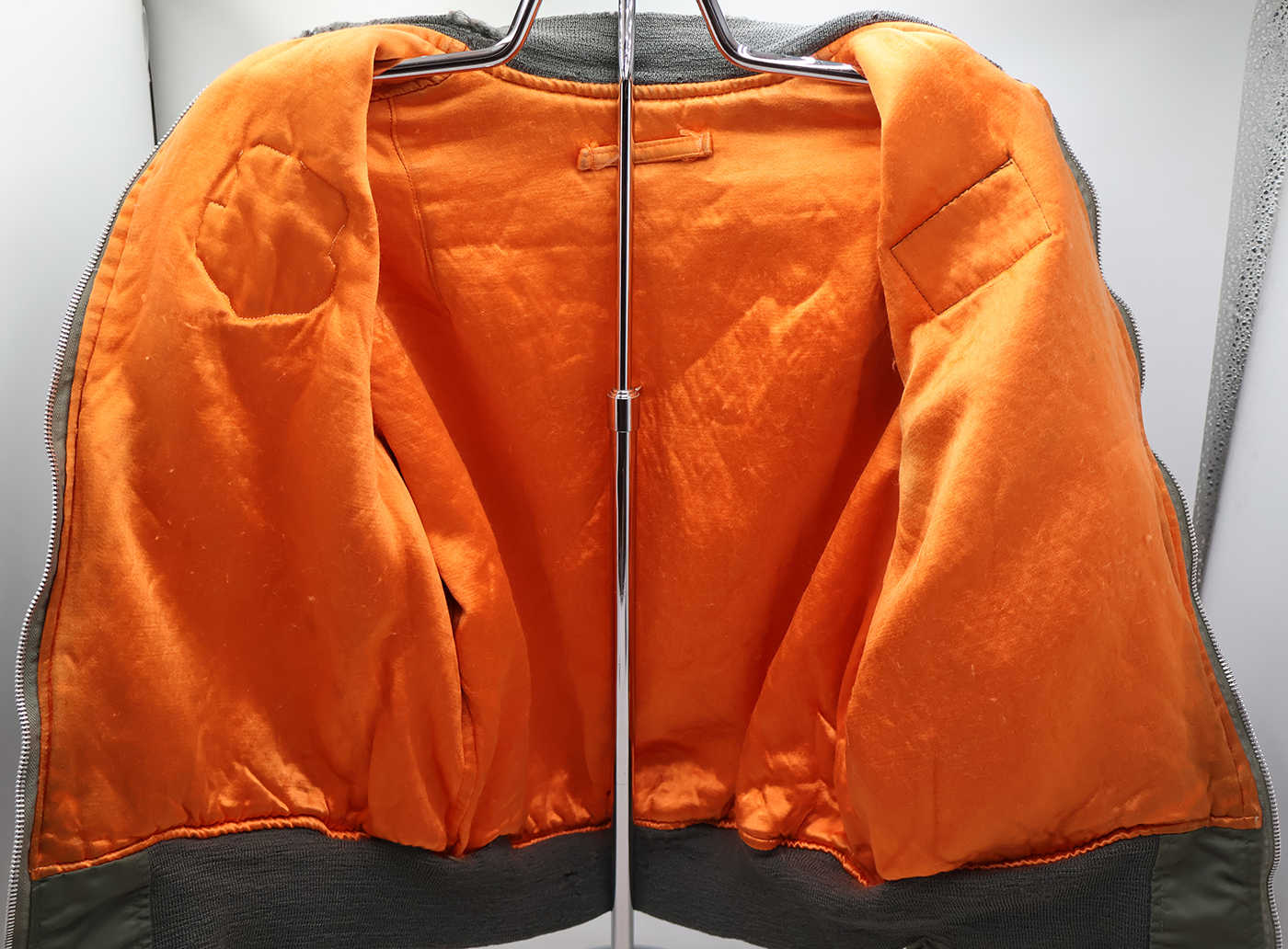 Vietnam era F-15 Test Pilot L-2B Flight Jacket. 1972 dated. All of the insignia is US made. F-15 Joint Test Force patch on the left sleeve, Test flight center on the chest and Climate Test Team on the right sleeve. Jacket is in good condition with some wear. Some wrinkles from storage. The SCOVILL zipper works well. The lining is in good shape. The knit cuffs and base of the jacket have some holes (see photos). Jacket is labelled a size medium. Jacket measures shoulder to shoulder 19 inches, front chest size 19 inches, sleeve length 23 inches and top of the neck to the base of the jacket is 25 inches.