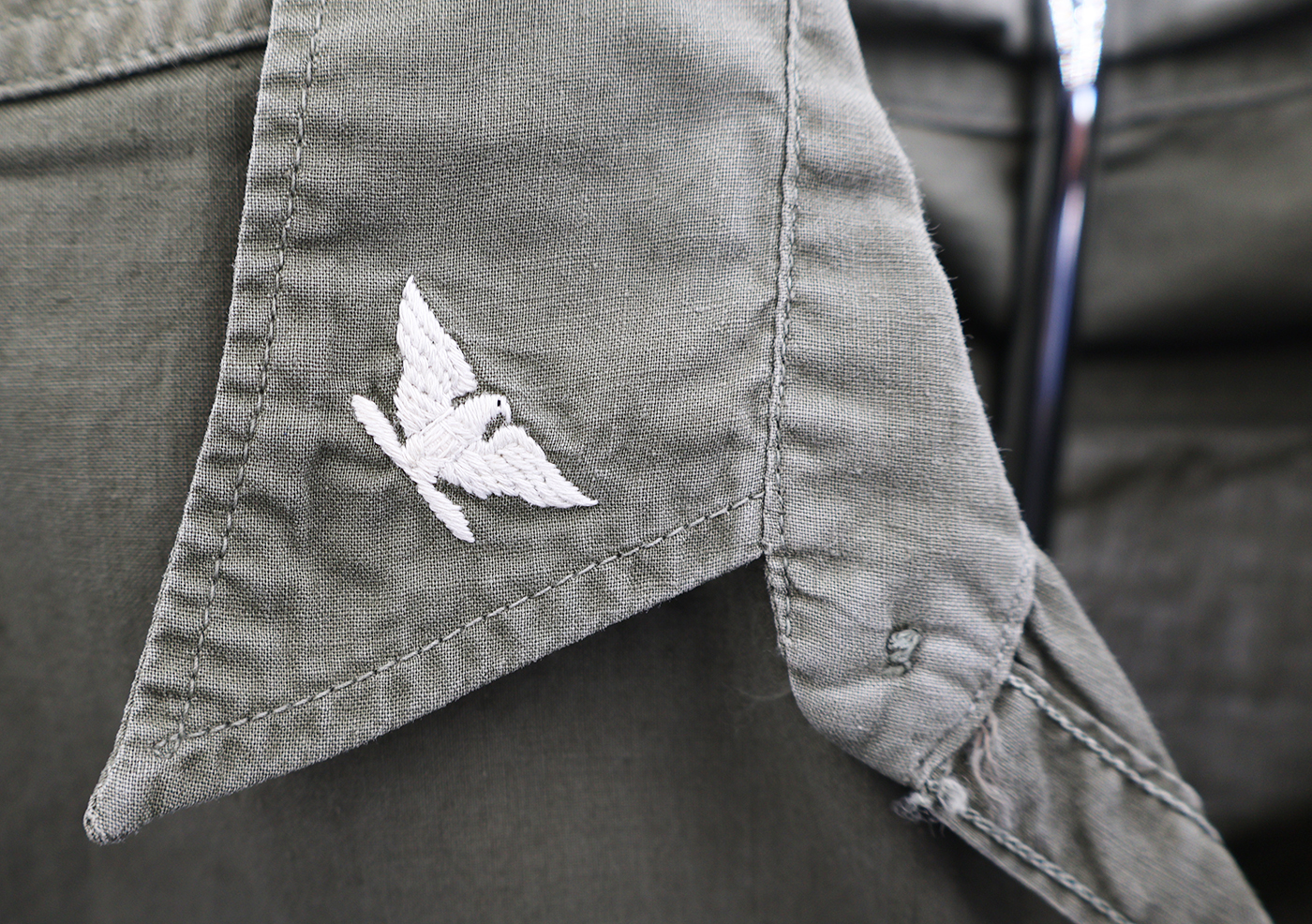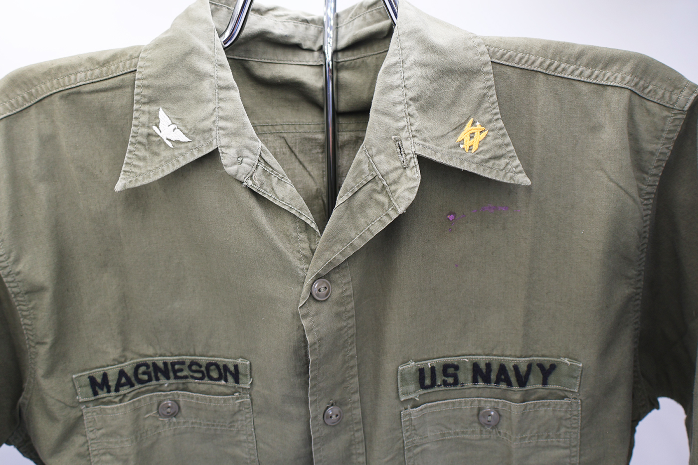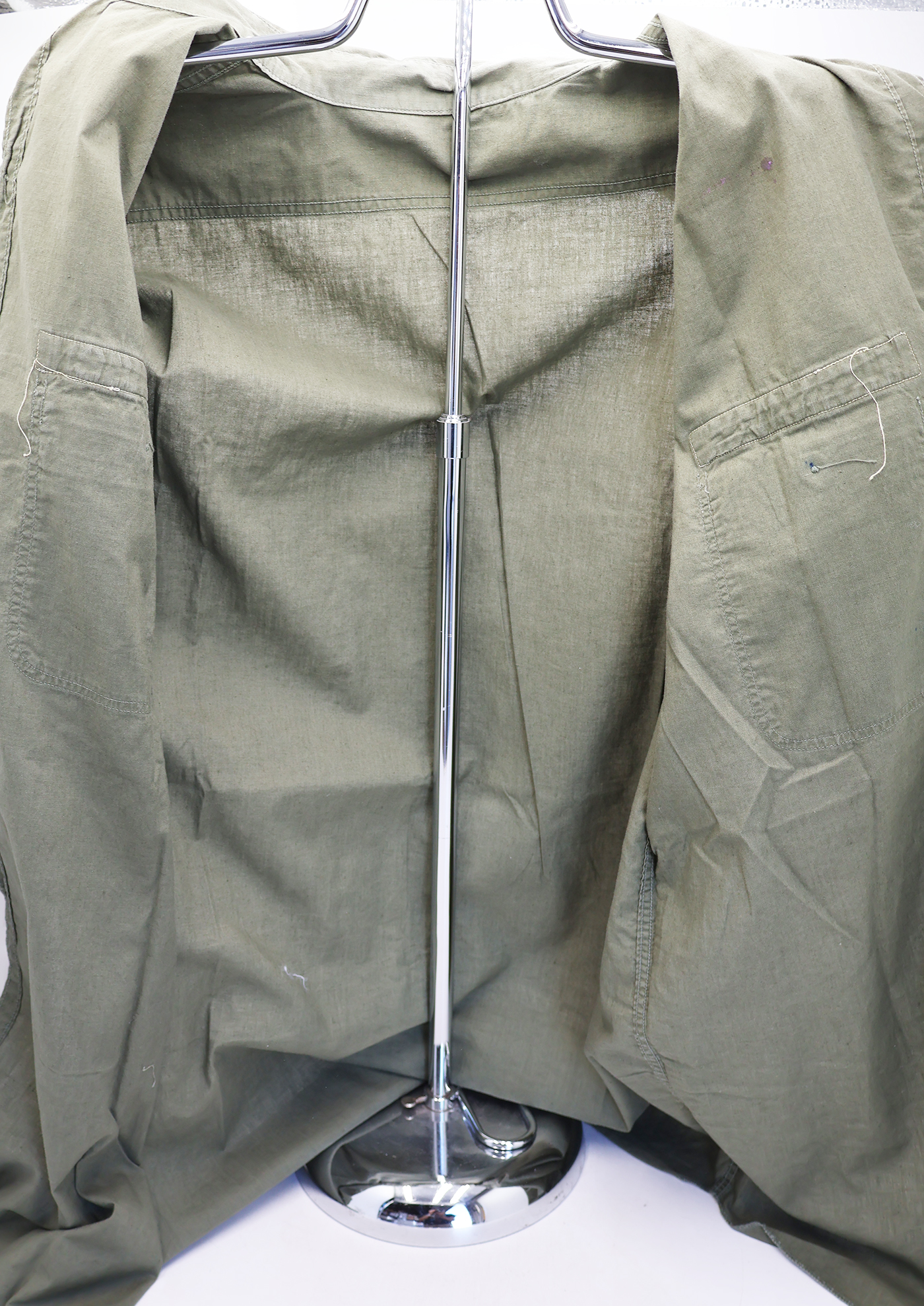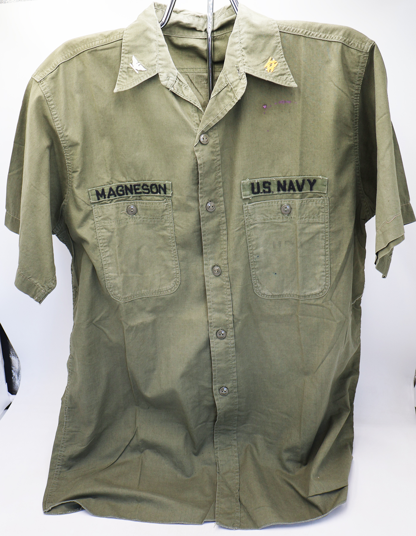 Vietnamese Made US Navy P-4 Work Shirt. Thin green cotton material. Shirt has some stains, but no notable damage or wear. All insignia is Viet made. The collar insignia is direct embroidered. Shirt measures shoulder to shoulder 18 inches, front chest size 20 inches, and top of the neck to the base of the jacket is 32 inches.