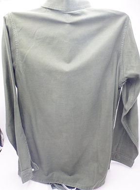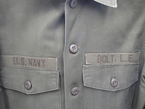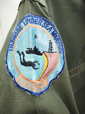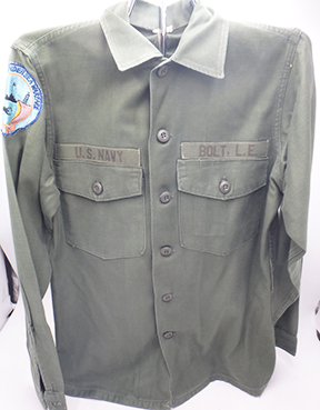 Vietnam US Navy Inshore Undersea Warfare Fatigue Shirt. Standard issue OG-107 shirt. The insignia is Japanese made. On the left shoulder is a Japanese made Inshore Undersea Warfare patch. Has been used but still in great shape. Labelled a size 14.5 x 33.