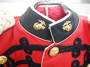 Vietnam era USMC Band Dress Jacket. Dress jacket is in good condition with just minor wear. One of the buttons on the left cuff is missing. Insignia is in very good condition. Jacket measures shoulder to shoulder 18 inches, front chest size 20 inches, sleeve length from shoulder to cuff is 25 inches and top of the neck to the base of the jacket is 35 inches.