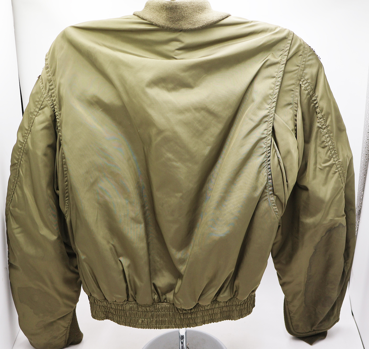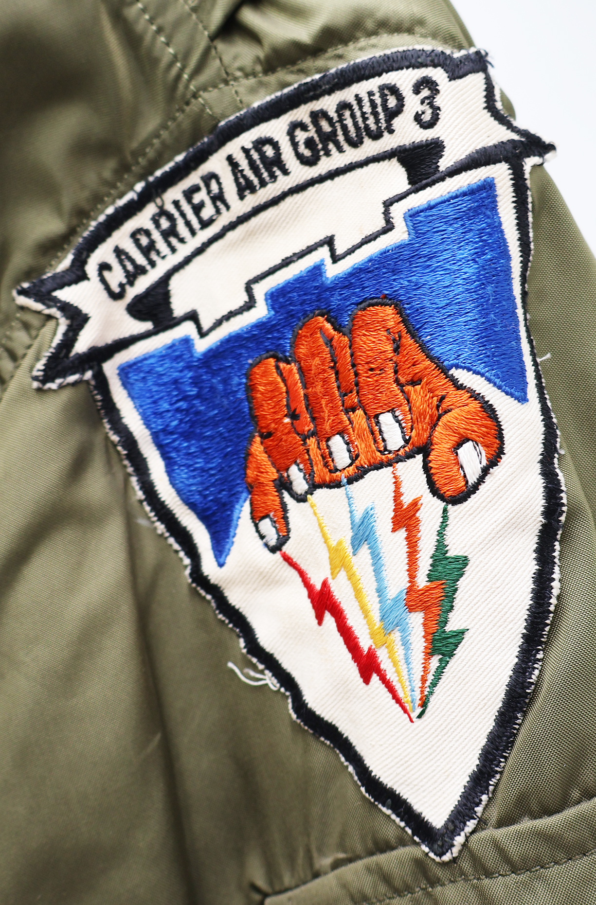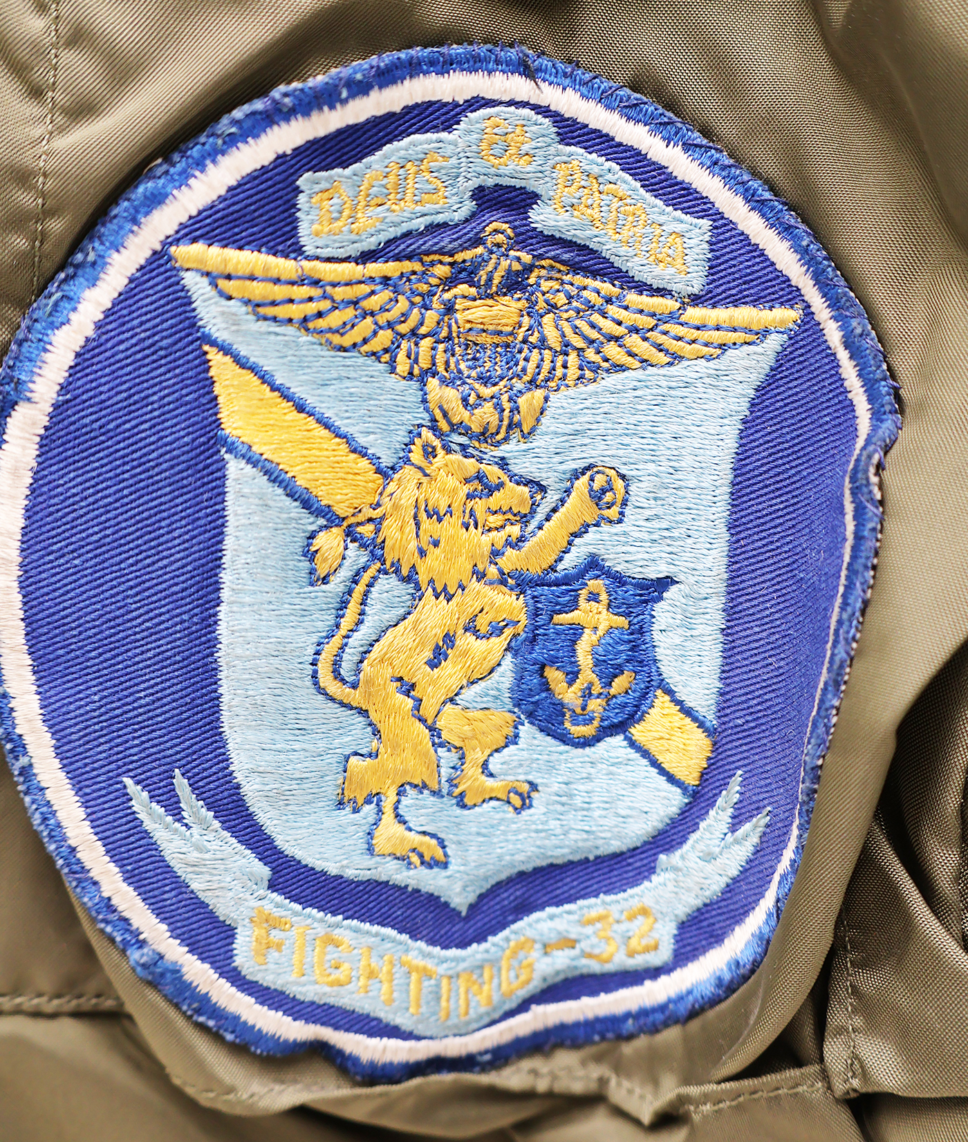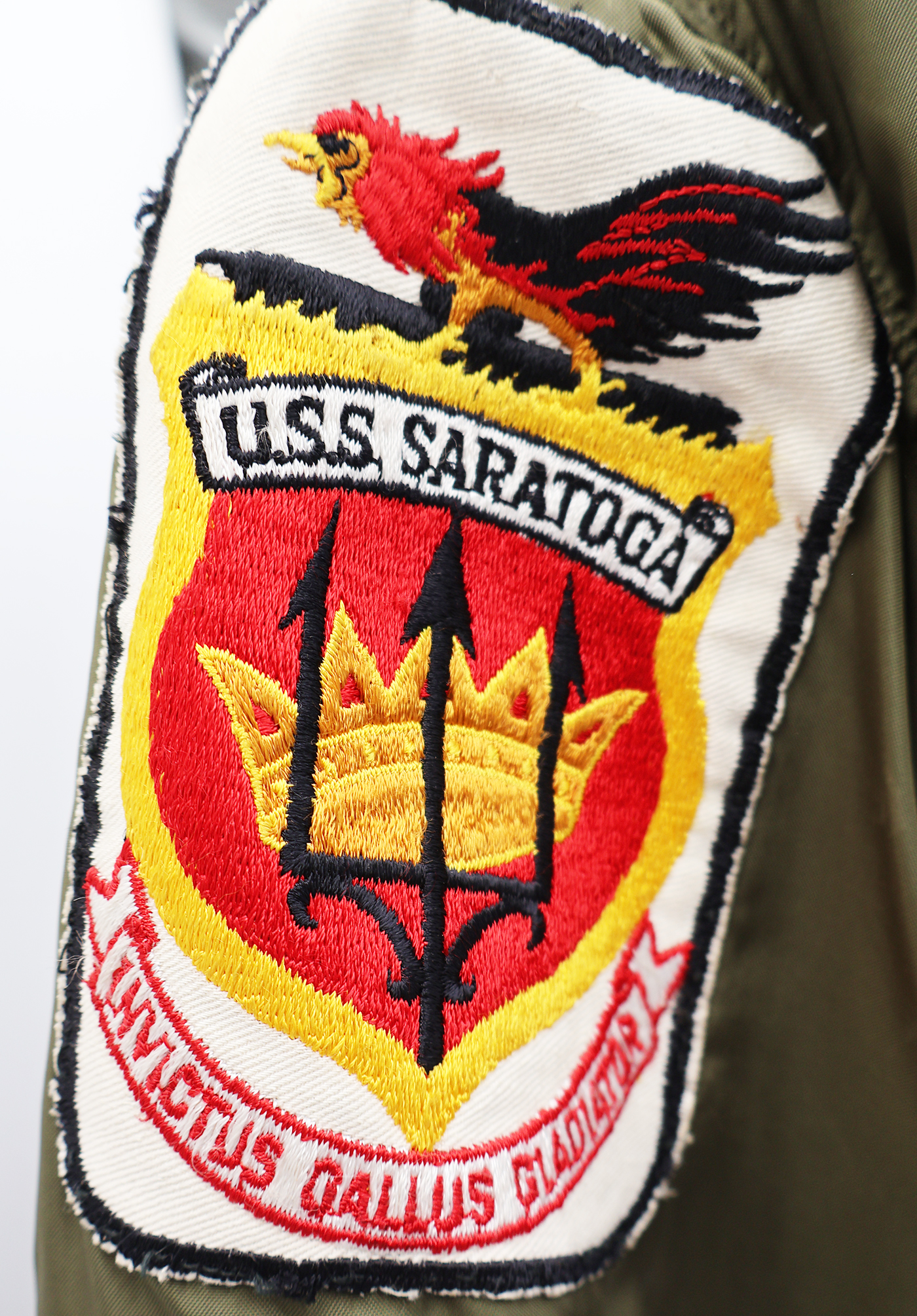 Vietnam era US Navy VF-32 "Fighting Swordsman" WEP Flight Jacket. 1968 dated. All of the insignia is US made. Carrier Air Group 3 patch on the left sleeve, VF-32 "Fighting Swordsman" on the chest and USS Saratoga on the right sleeve. Jacket is in good condition with some wear. Some wrinkles from storage. The SCOVILL zipper works well. The lining is in good shape. The jacket is labelled a size 38R. Jacket measures shoulder to shoulder 17 inches, front chest size 19 inches, sleeve length 25 inches and top of the neck to the base of the jacket is 26 inches.
