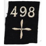 WWI 498th Aero Squadron Enlisted Patch. White hand embroidered details on a dark wool background. Unused.