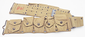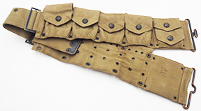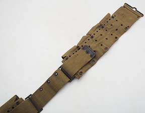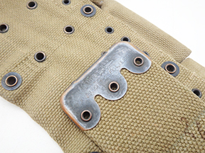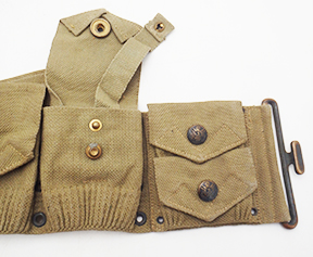 Pre-WWI eagle snap pea green cartridge belt. The belt is in good condition and the hardware is clean. No damage to the belt’s integrity. Some of the snaps are difficult to open, but appeared clean. There is some fraying to the webbing, but nothing severe. There is 1918 written on the inside of the belt. But the date of the belt is probably 1915 or older. The makers mark is washed out and cannot be read.