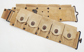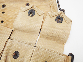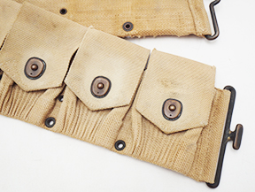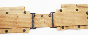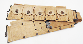 WWI M-1910 cartridge belt with pucker pockets. Canvas is Khaki in color. The belt is in good condition. The cotton/canvas is in good shape and the metal hardware is clean. The makers mark is worn and hard to read. Still a very useable belt.