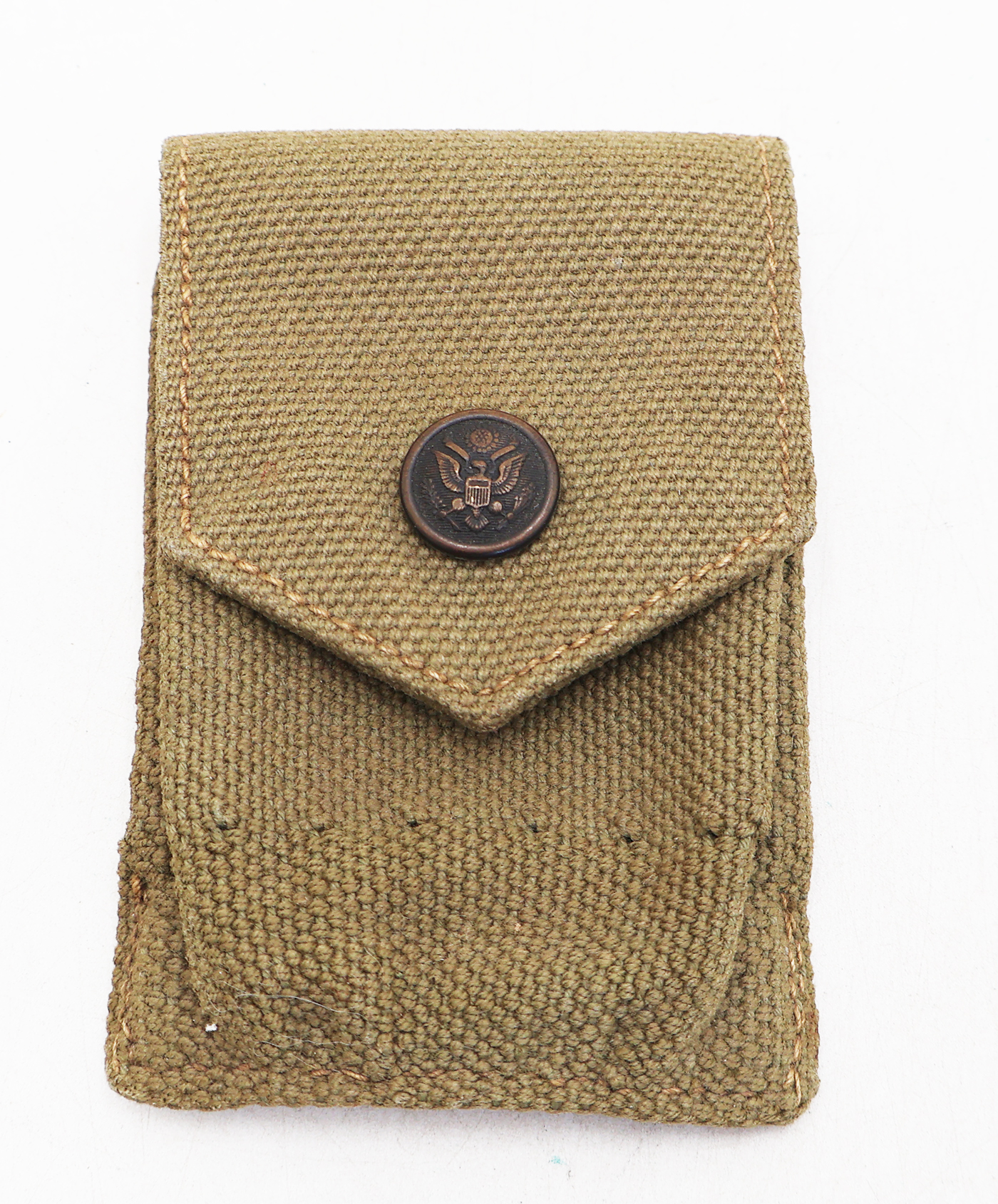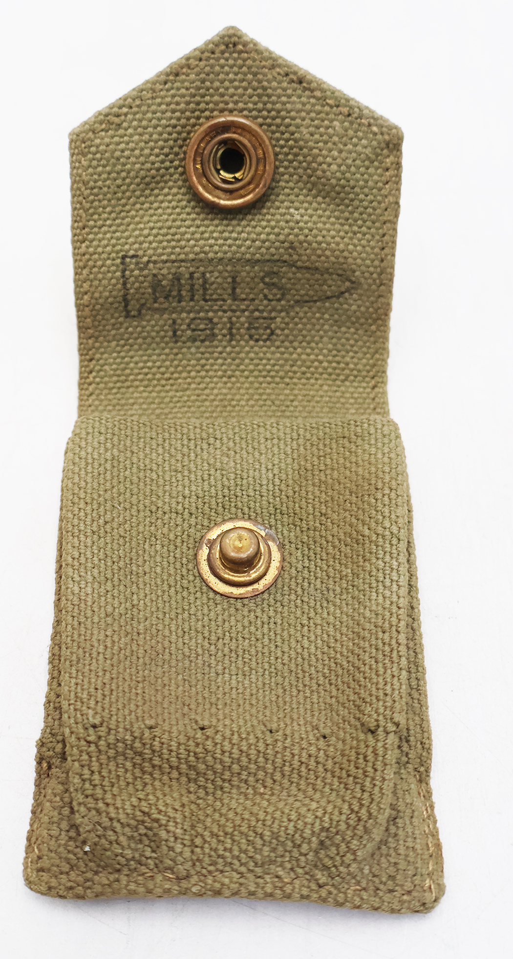 WWI era M1910 Pea Green Garrison Belt Ammo Pouch in unissued condition. The green cotton/canvas material is clean with no staining or any damage. The snap is very clean and undamaged. The pouch is marked MILLS 1915. Would be hard to find one in better condition.